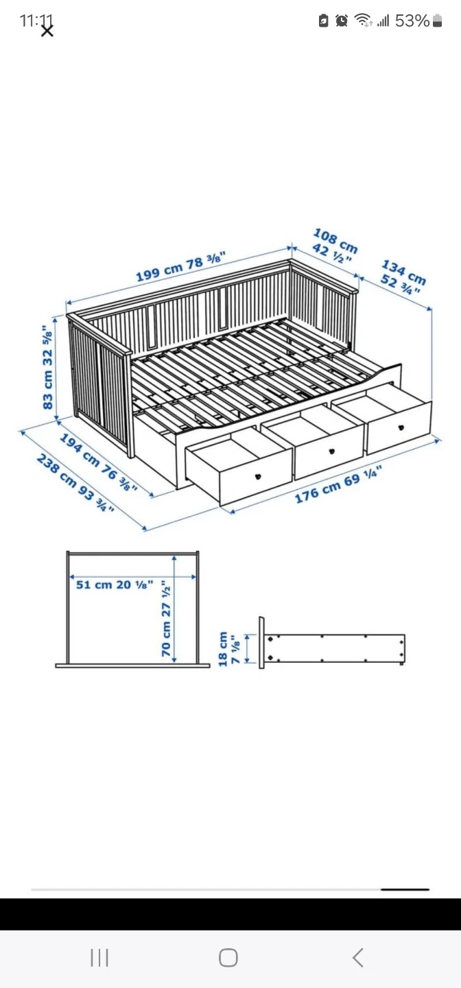 This white Hemnes daybed from IKEA comes with three drawers for ample storage. It's designed to fit two mattresses and has a twin size. The wooden slatted base provides good support. Use it only one year make me offer