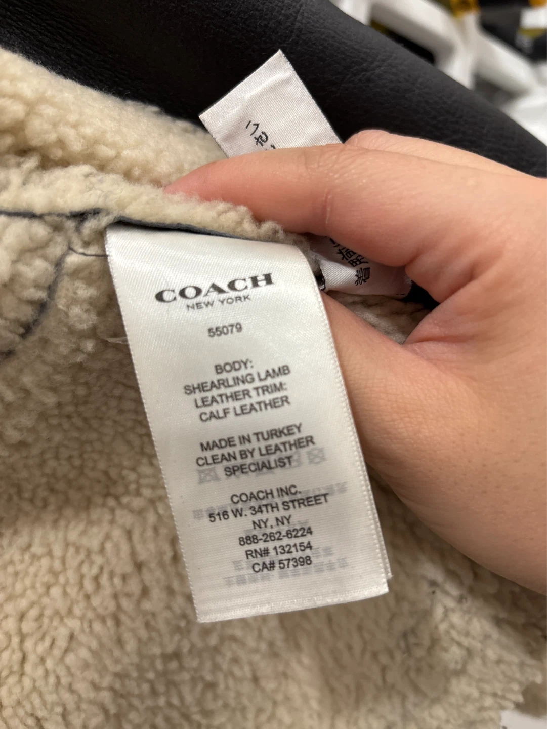 This Coach biker jacket features a shearling lamb body with calf leather trim. It's made in Turkey and designed for dry cleaning by a leather specialist. A stylish and warm choice for cooler weather!