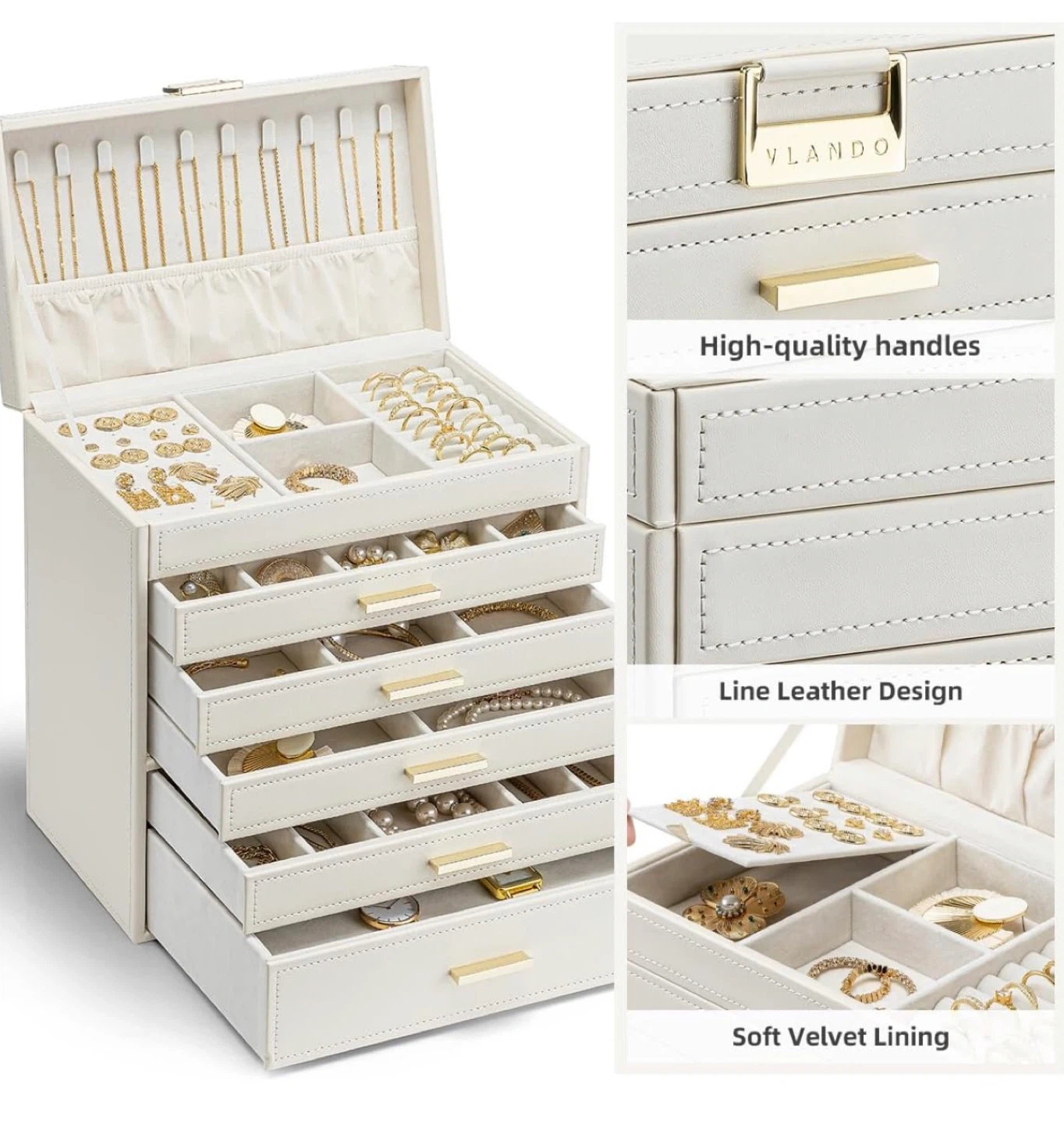 Keep your jewelry neatly organized with this Vlando jewelry box organizer! It features a soft velvet lining to protect your precious items and a line leather design for a touch of elegance. The high-quality handles make it easy to access your jewelry, and the multiple drawers provide ample storage space for stud earrings, earrings, hair pins, rings, necklaces, bracelets, watches, and sunglasses