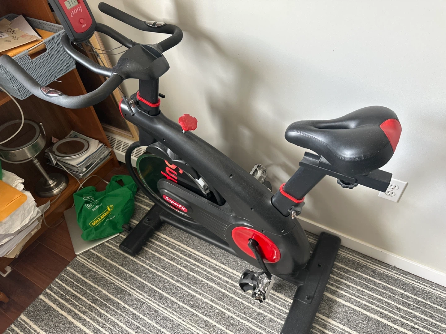 This is a SuperFit spin bike with an adjustable seat and handlebars. It features a digital display to track your workout metrics. Great for indoor cardio!