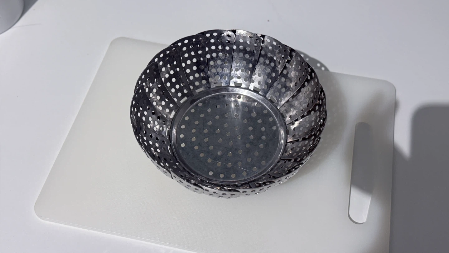 This is a stainless steel steamer basket. It's made of durable metal with many small holes for steaming food. It folds down for compact storage.
