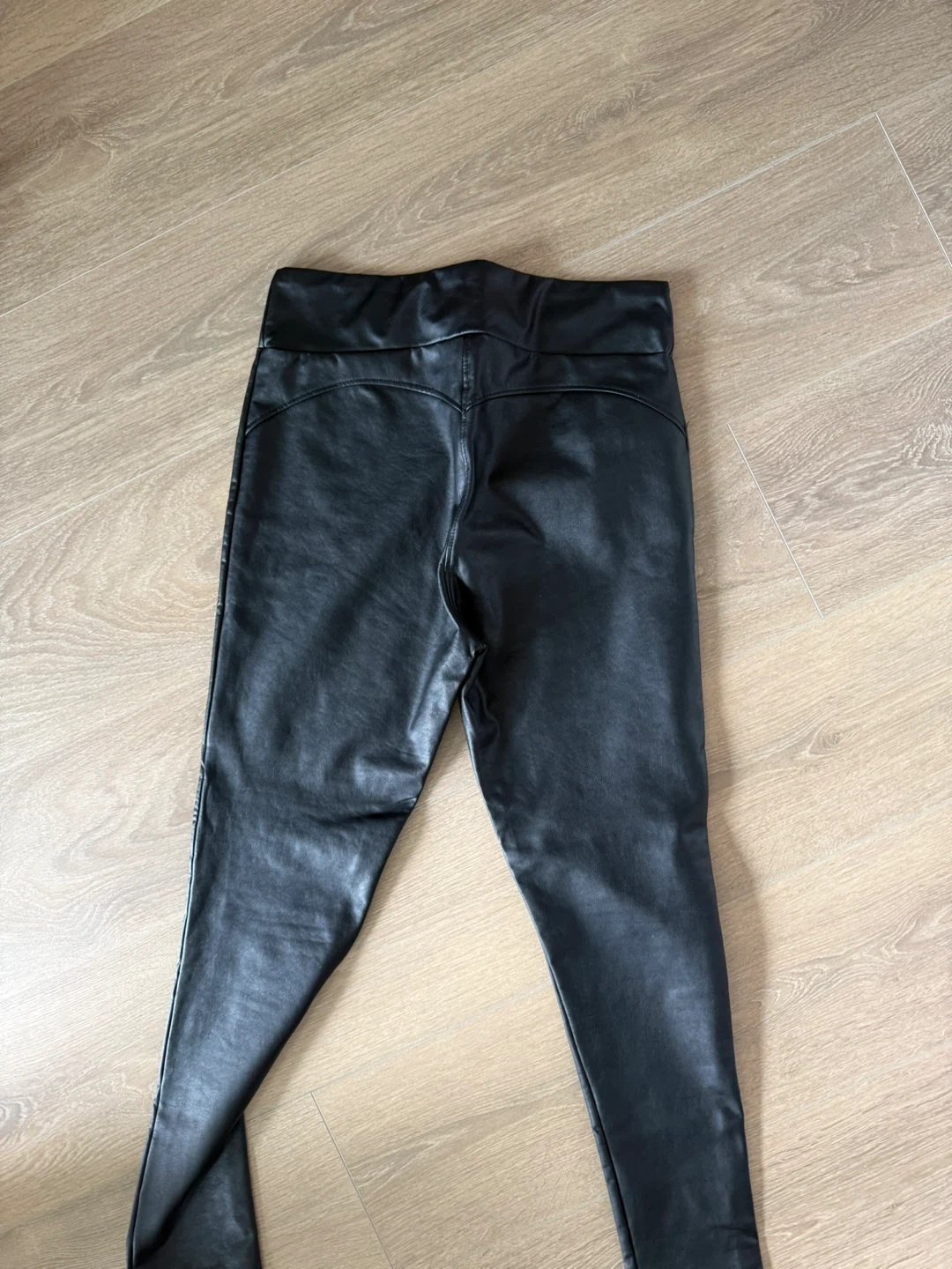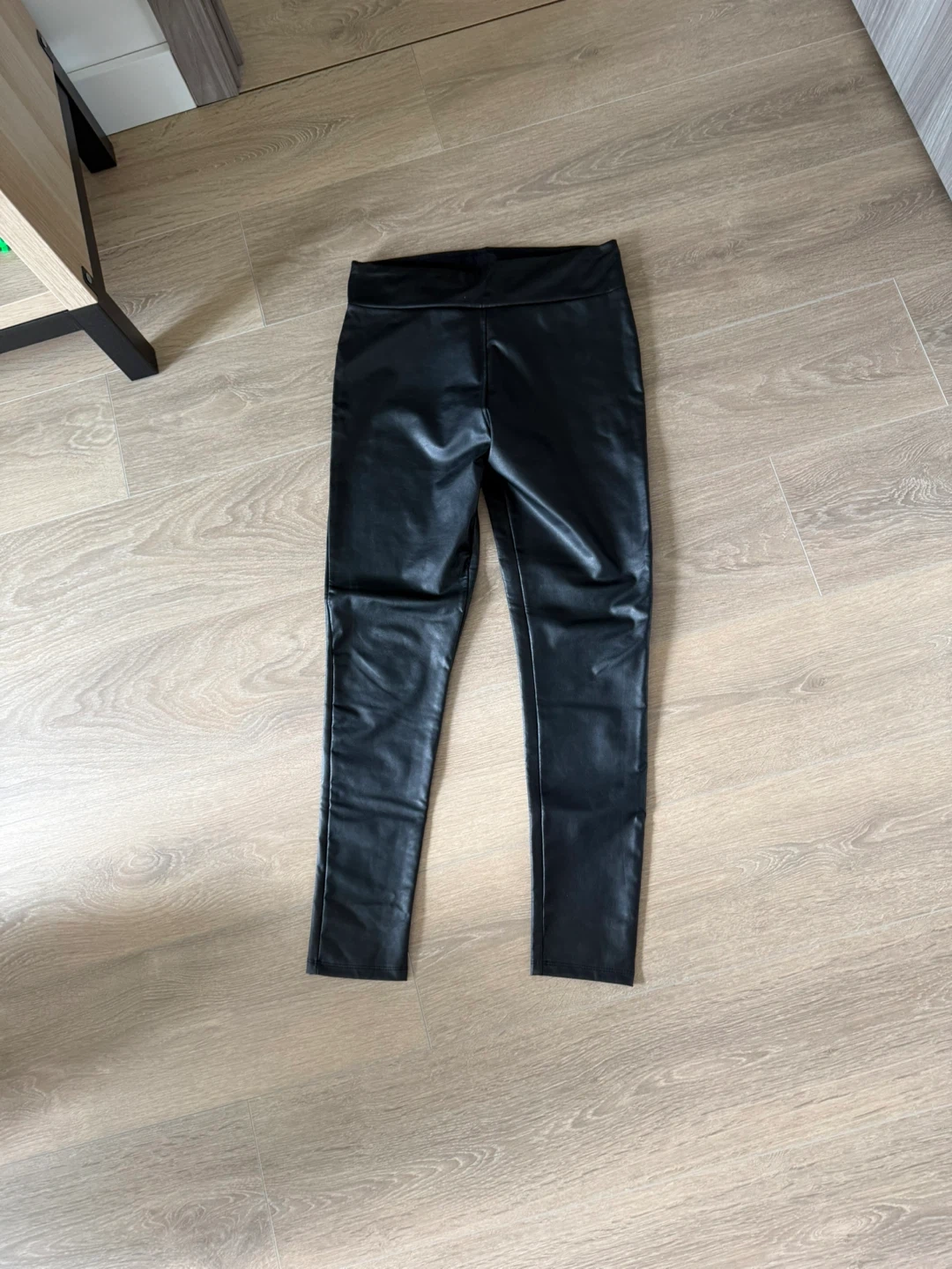 Black faux leather leggings with a high-waisted fit. Stretch material for comfort. Easy to dress up or down! The label says Large, but it would fit someone who wears Medium better since the leggings run slightly tight.