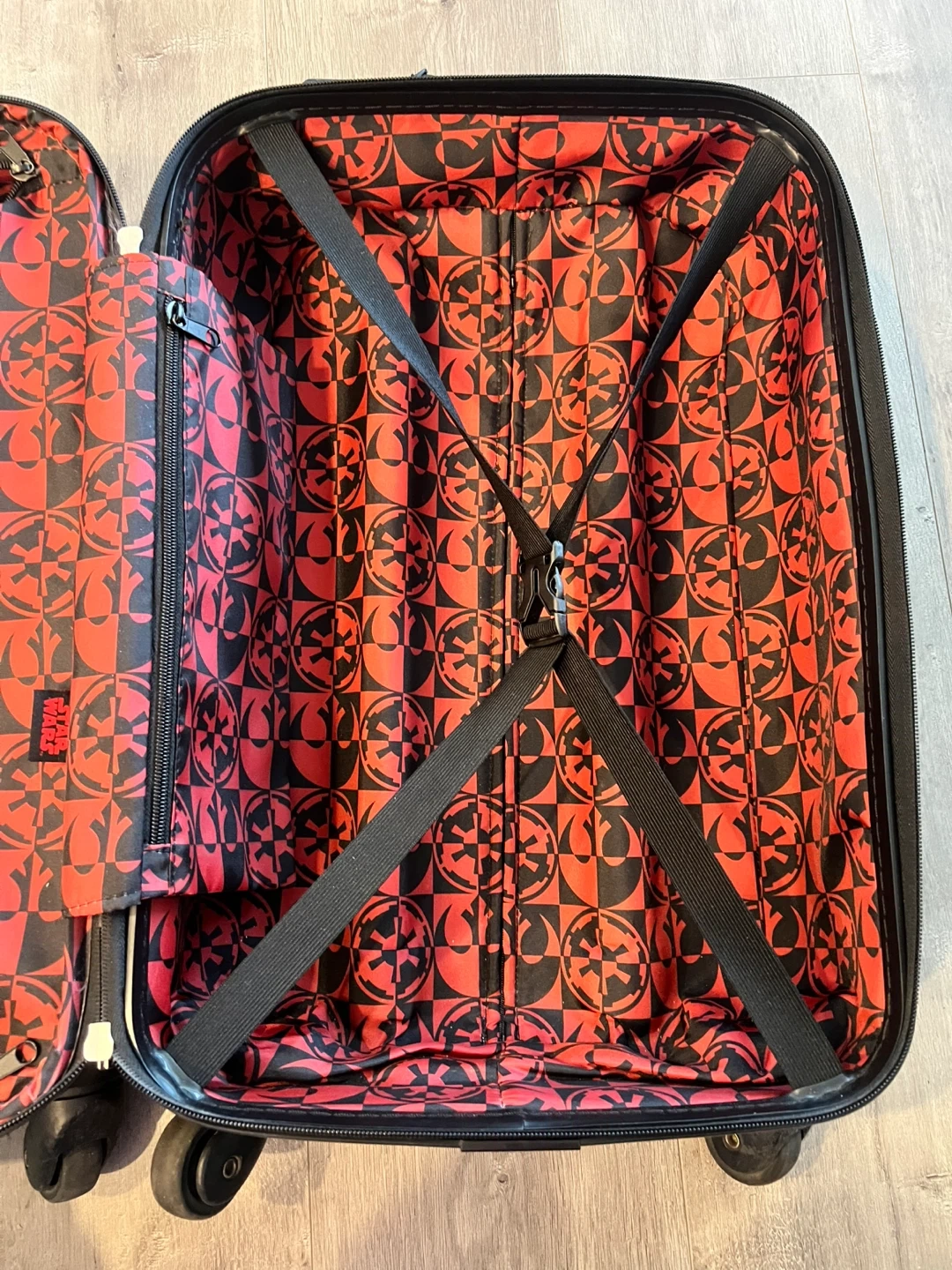 This is a rare black American Tourister rolling suitcase featuring a large Darth Vader graphic. It has a telescopic handle and four spinner wheels for easy manoeuvrability. The suitcase is made of durable hard-shell material and includes a Star Wars branded luggage tag. Wear outside , inside clean and excellent condition.