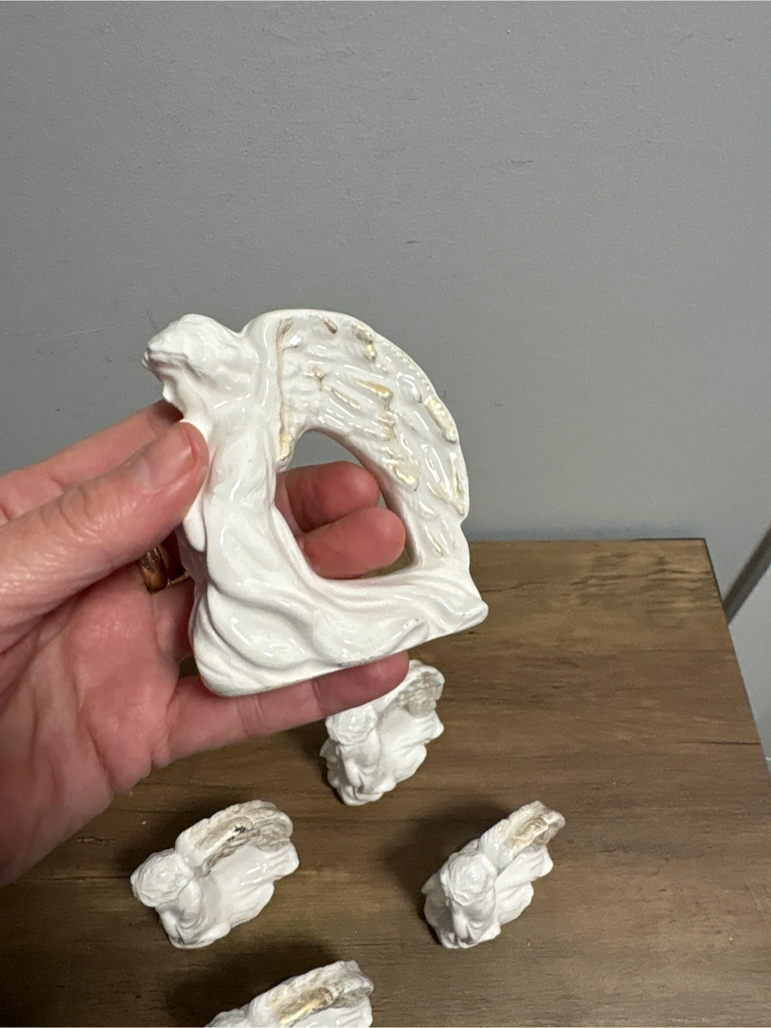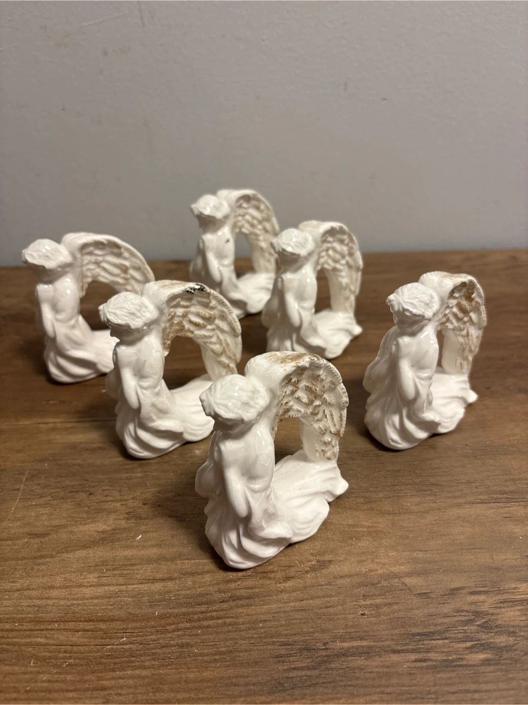 A set of six ceramic angel napkin rings. These charming rings add a touch of elegance to any table setting. White ceramic with gold accents on the wings. Perfect for holiday dinners or special occasions!