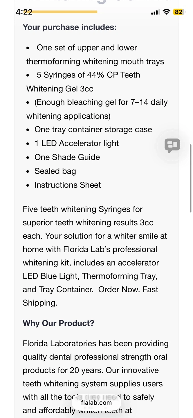 This kit includes 5 syringes of 44% Carbamide Peroxide Teeth Whitening Gel (3cc each), one LED accelerator light, one shade guide, and a set of upper and lower thermoforming whitening mouth trays. It also comes with a tray container storage case and instructions. This system supplies users with a professional strength teeth whitening kit.