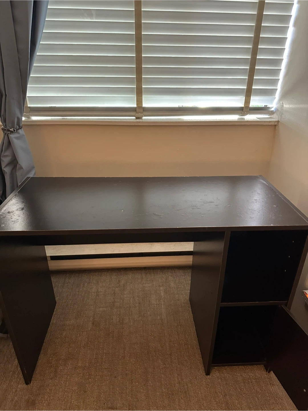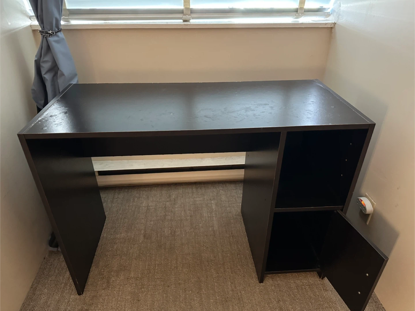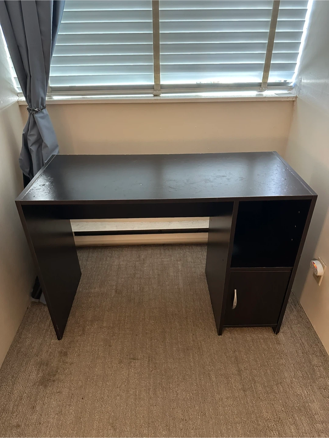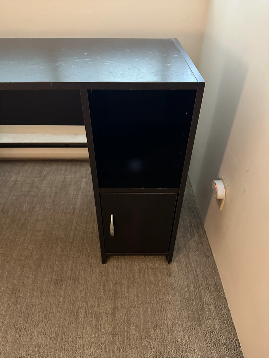 Functional dark brown desk. Has open shelf and cabinet with door on the side. Good for home office or student space.