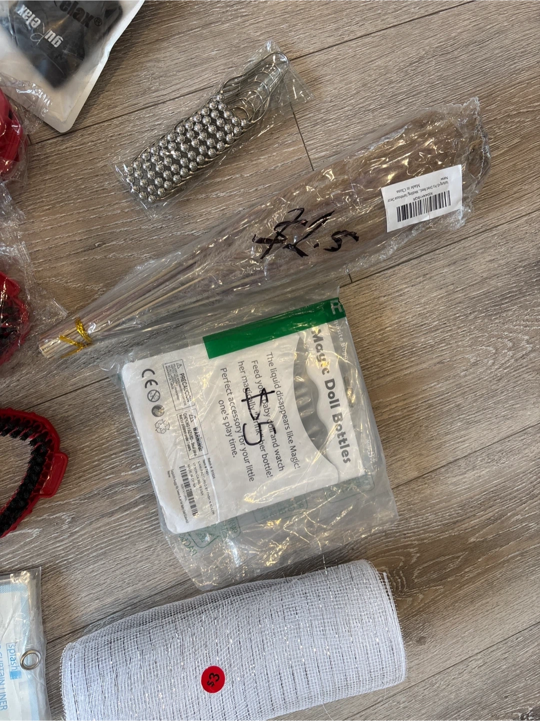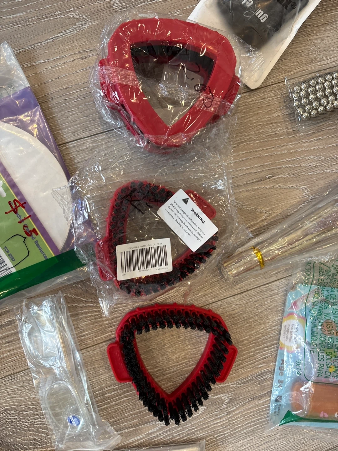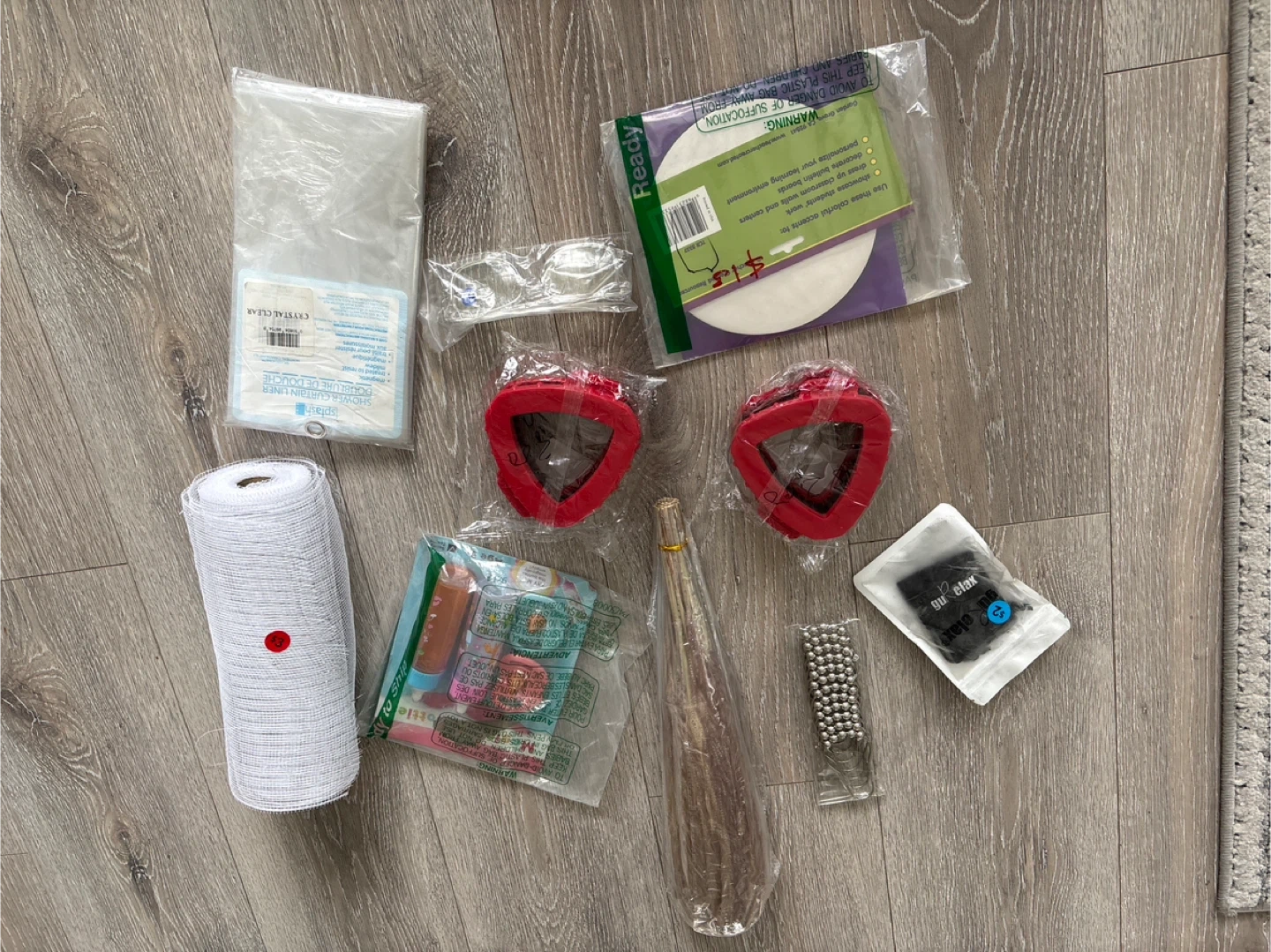 A collection of crafting and household items including mesh fabric, cleaning brushes, and decorative elements. The bundle contains various tools for your projects and home organization needs.