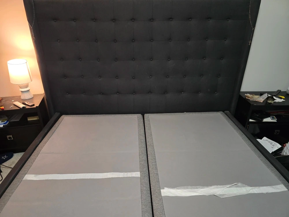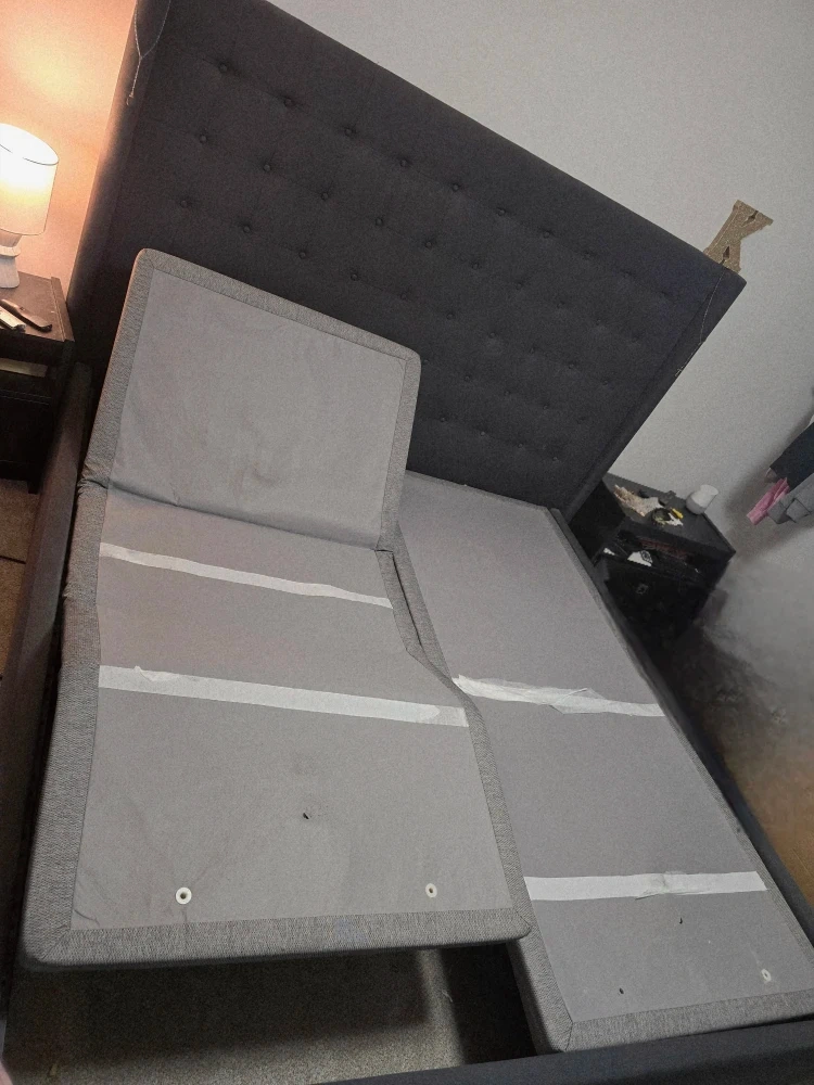Selling a grey upholstered bed frame and king split adjustable bed....one side is missing remote and power cord thats why its priced low its due to movers losing them. You can can number on back of other remote and order both.