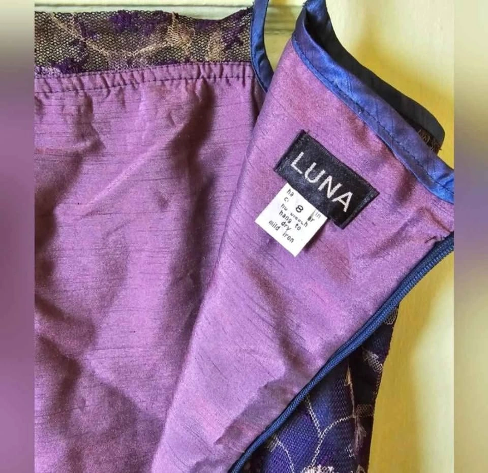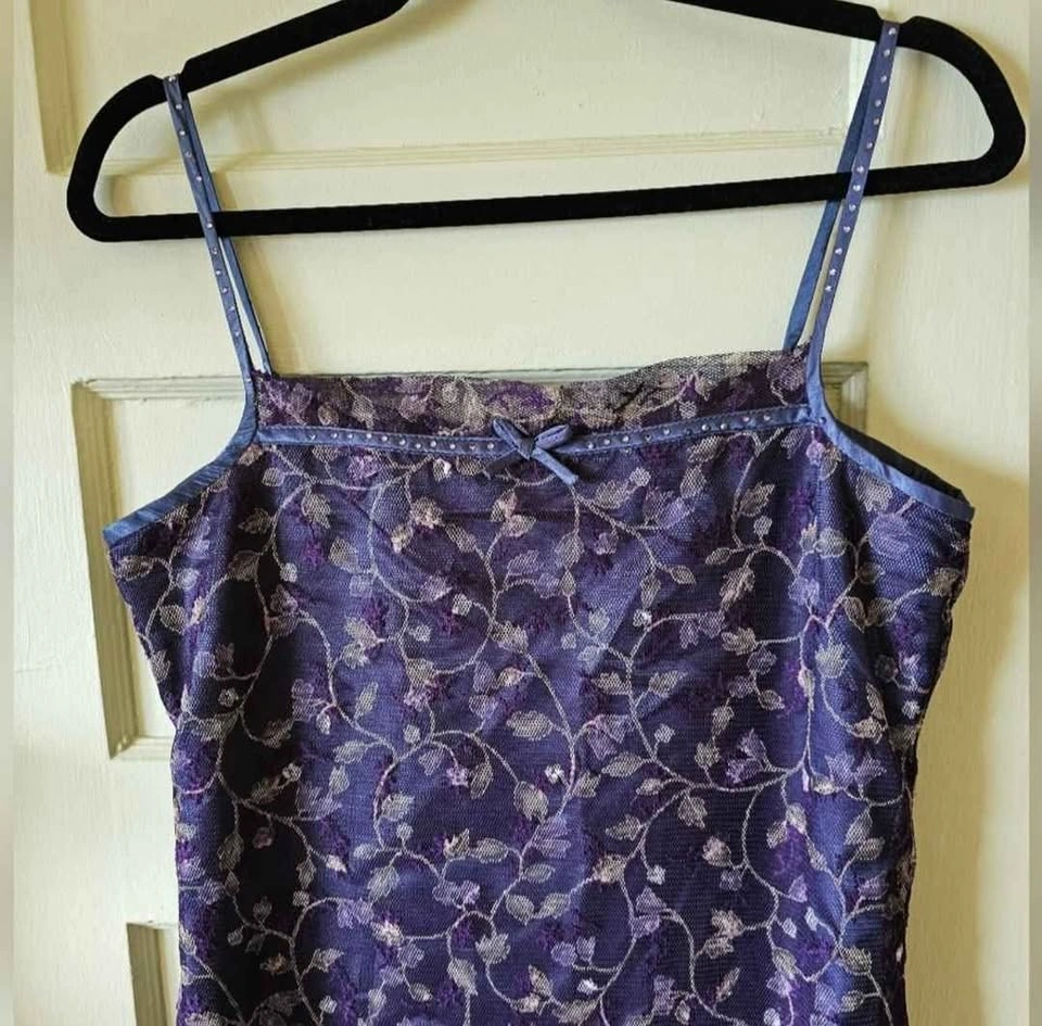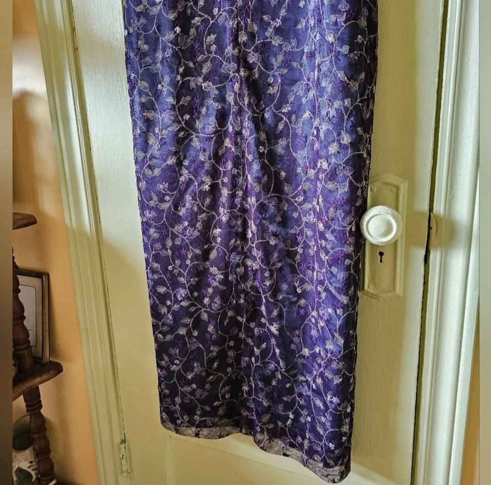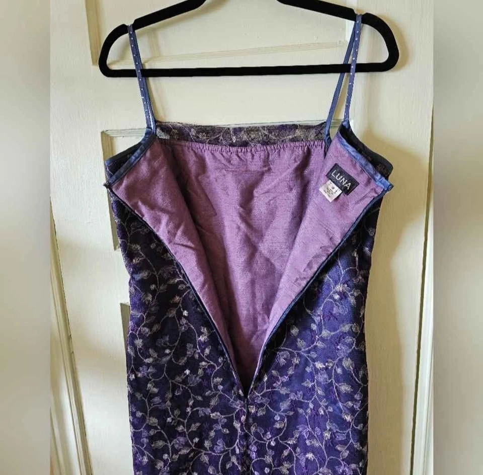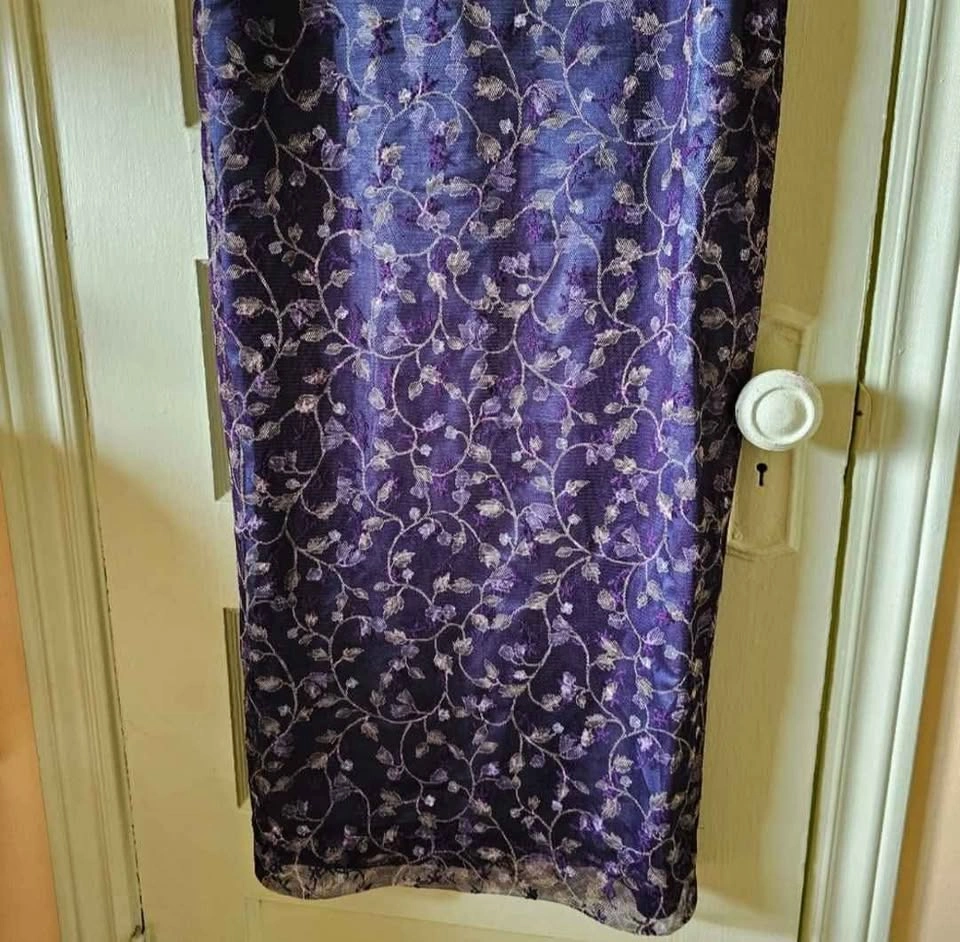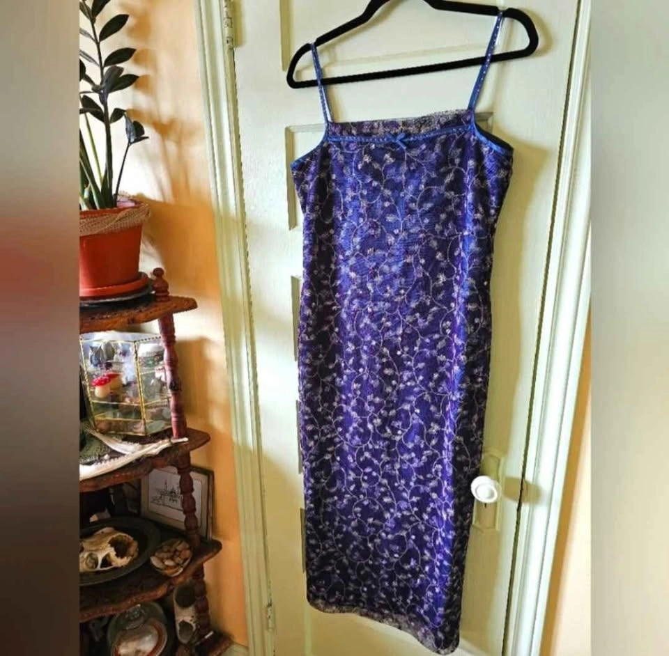 Amazing and unique true vintage strappy sheath style maxi dress from the brand Luna. Fully lined with a silky iridescent material that shimmers from muted dark blue to muted purple, and with a top layer of dark purple mesh covered in flowers and leaves! Dress is trimmed with the same iridescent material as the lining to form the straps and accents, and there are tiny purple rhinestones across the chest and on the straps. Looks fantastic on its own or with a long sleeve top underneath. Closes with a hidden rear zipper and has a slit in the back for ease of movement.