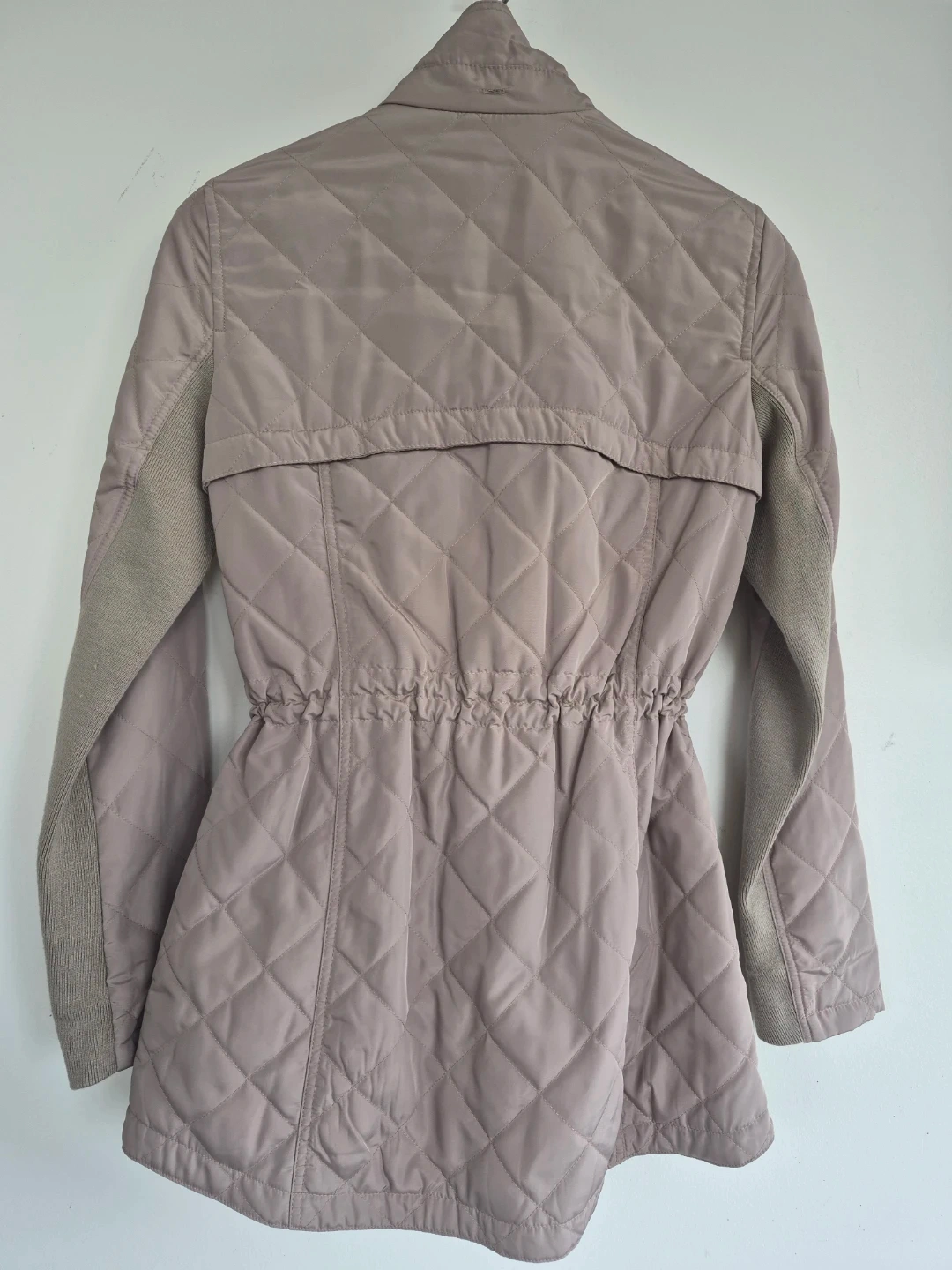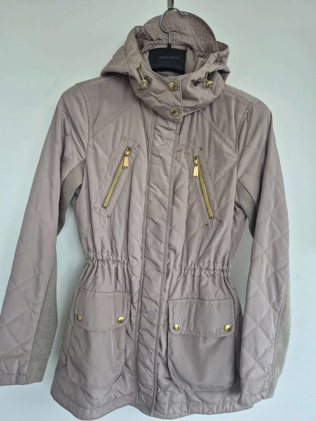 Quilted parka jacket with a drawstring waist. It's made with a blend of materials and features zippered pockets and a hood. Great for cooler weather!