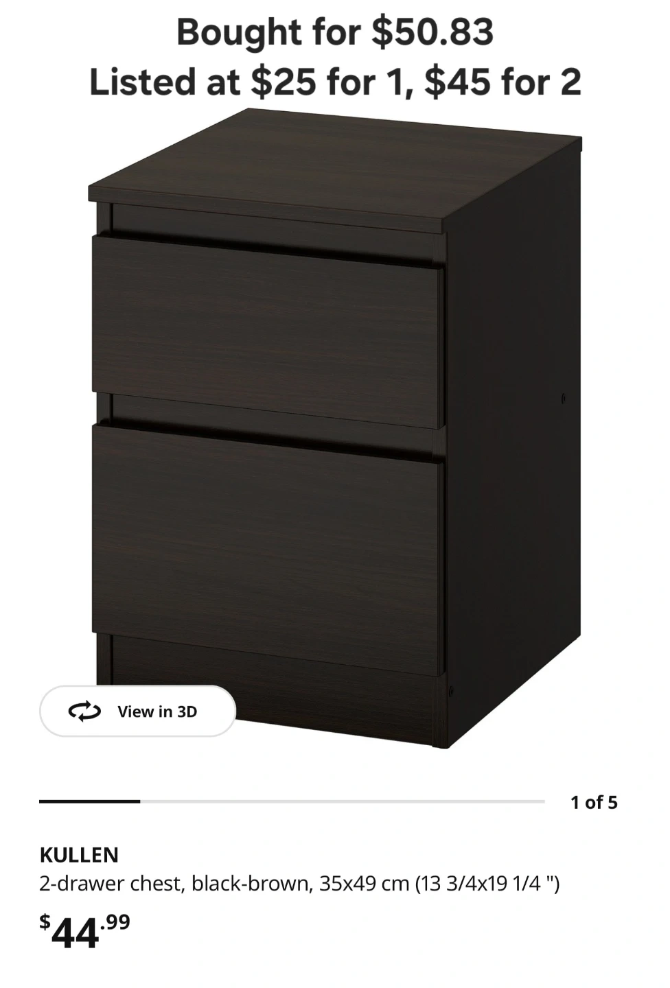 Organize your space in style with these IKEA KULLEN 2-drawer chests in black-brown. Each chest measures 35 × 49 cm, perfect for bedrooms, living rooms, or small apartments. I have two pieces available, and they pair perfectly with my IKEA MALM bed listing, making a great coordinated setup.