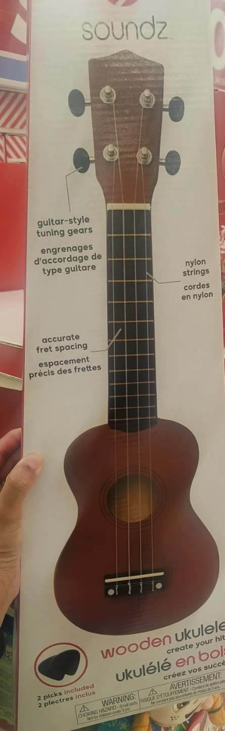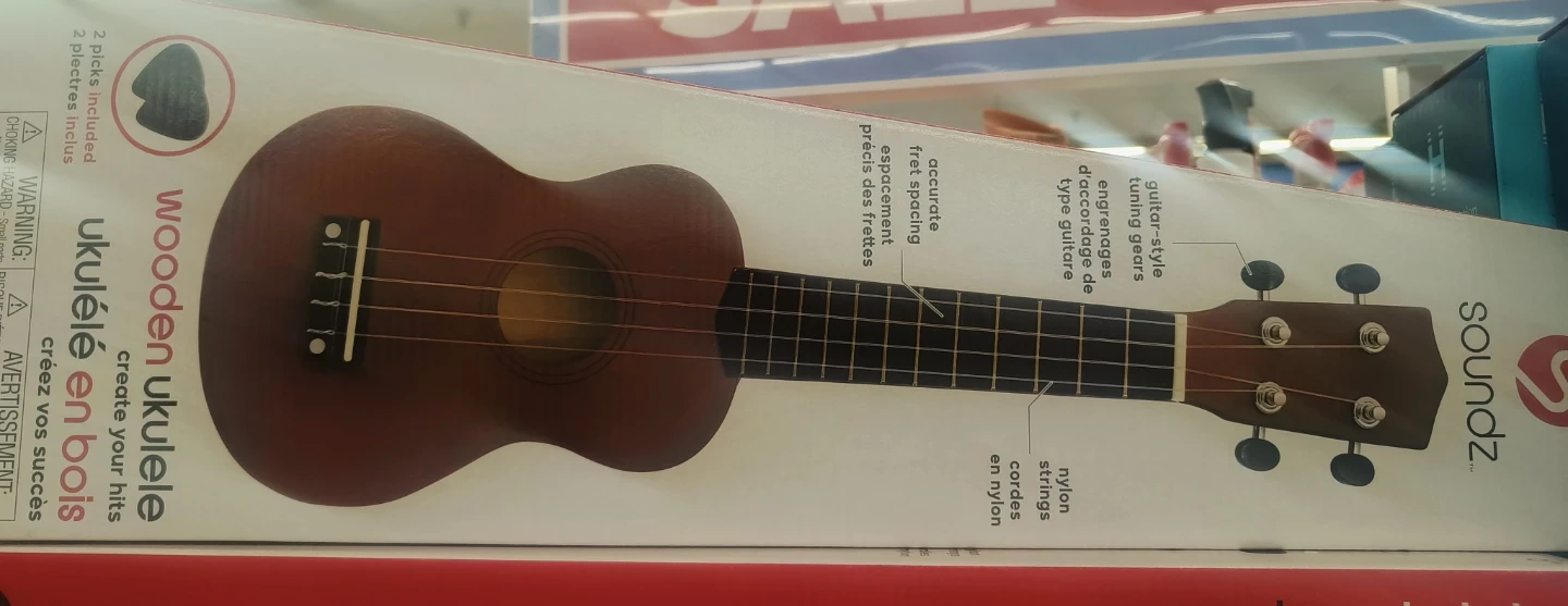 Selling a brand new Soundz wooden ukulele, still in its original box! It features guitar-style tuning gears, accurate fret spacing, and nylon strings. Also includes 2 picks so you can start strumming right away