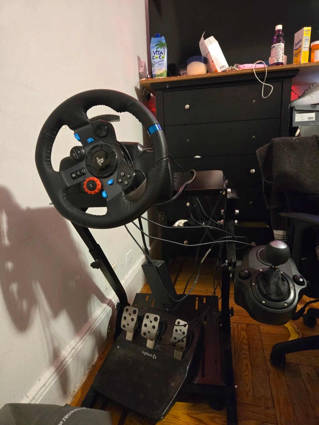 Logitech G29 racing wheel, pedals, and shifter included. This setup offers a realistic driving experience for racing games. The wheel features leather trim and responsive buttons. Pedals have a metal finish. Shifter is also included for manual transmission simulation.