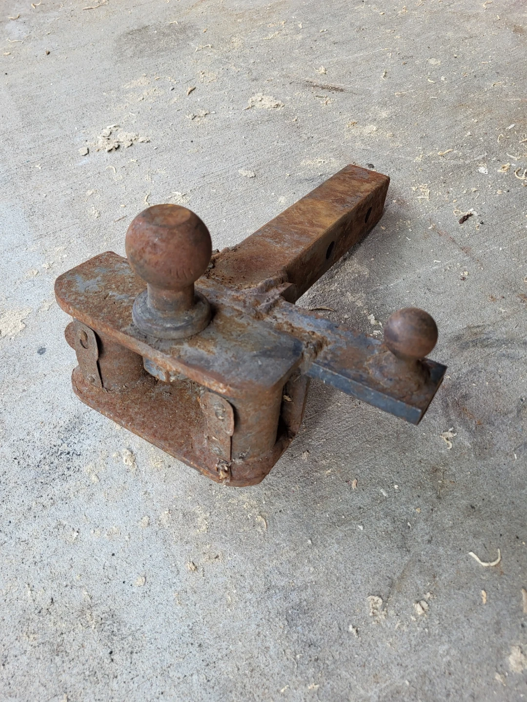 This is a rusty hitch ball mount. It has a 2-inch receiver size and a 2-inch ball. (I believe.) The mount extends about 7.5 inches from the receiver opening.