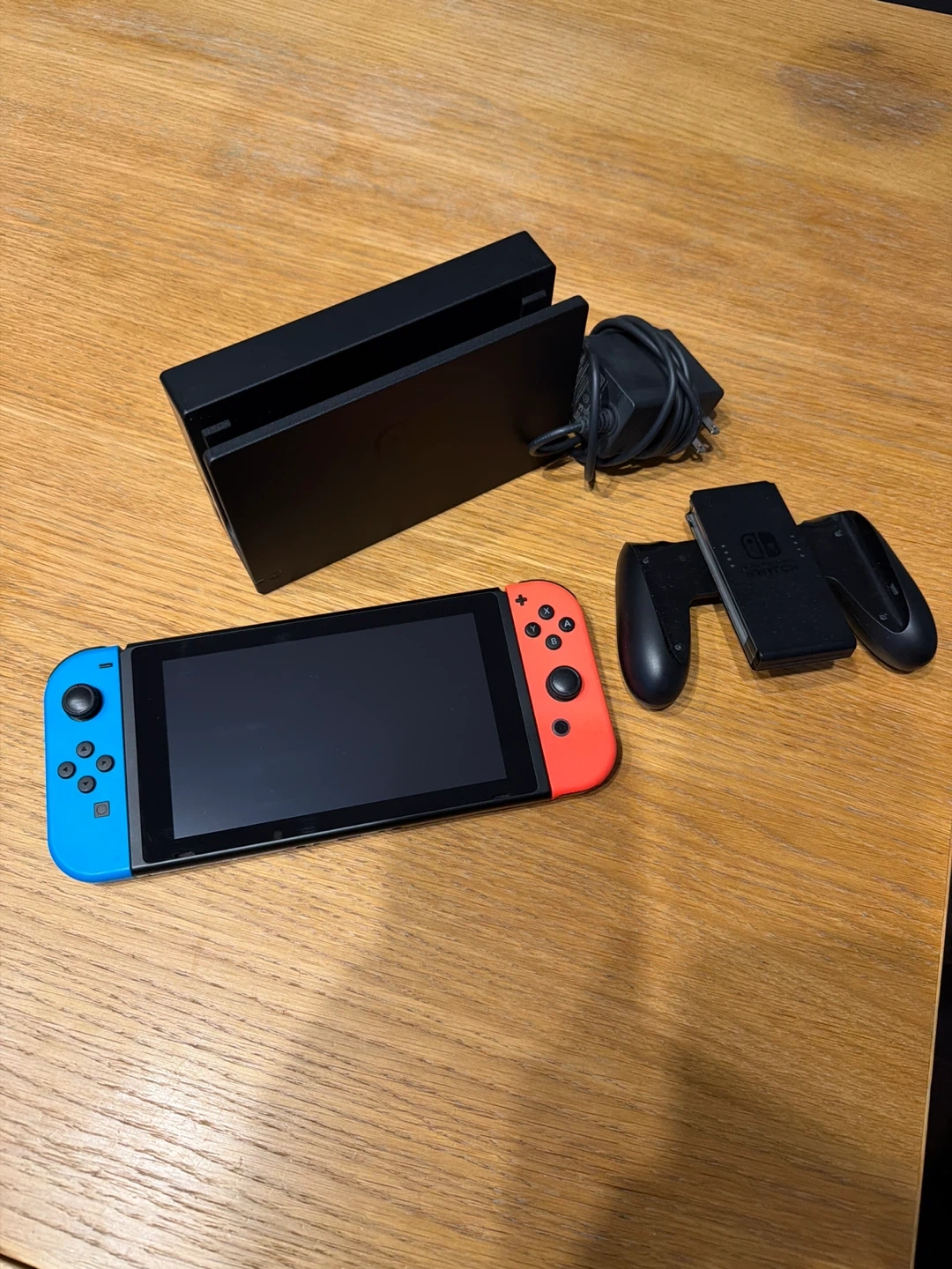 This is a Nintendo Switch console, complete with its dock and red and blue Joy-Cons. It also includes a charging grip. It's ready for gaming on the go or at home!