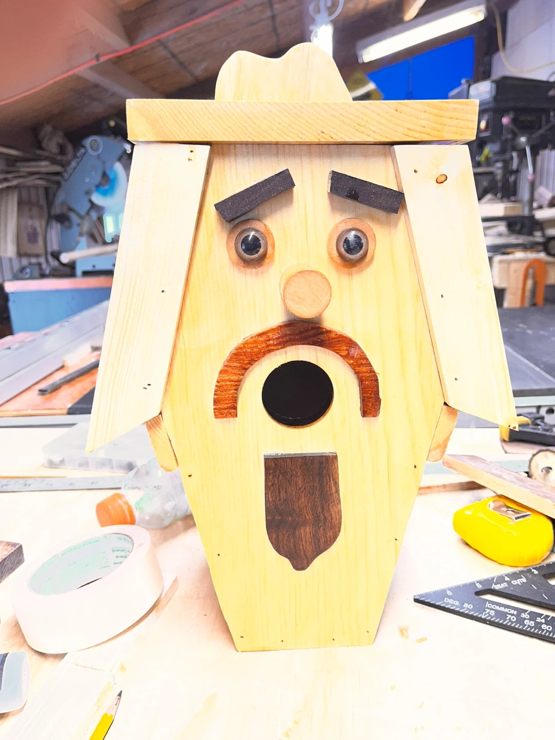 This unique wooden birdhouse is crafted with care. It's designed with whimsical facial features for a charming look. Perfect for adding a touch of personality to your garden!