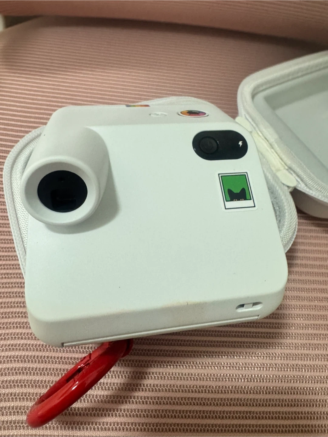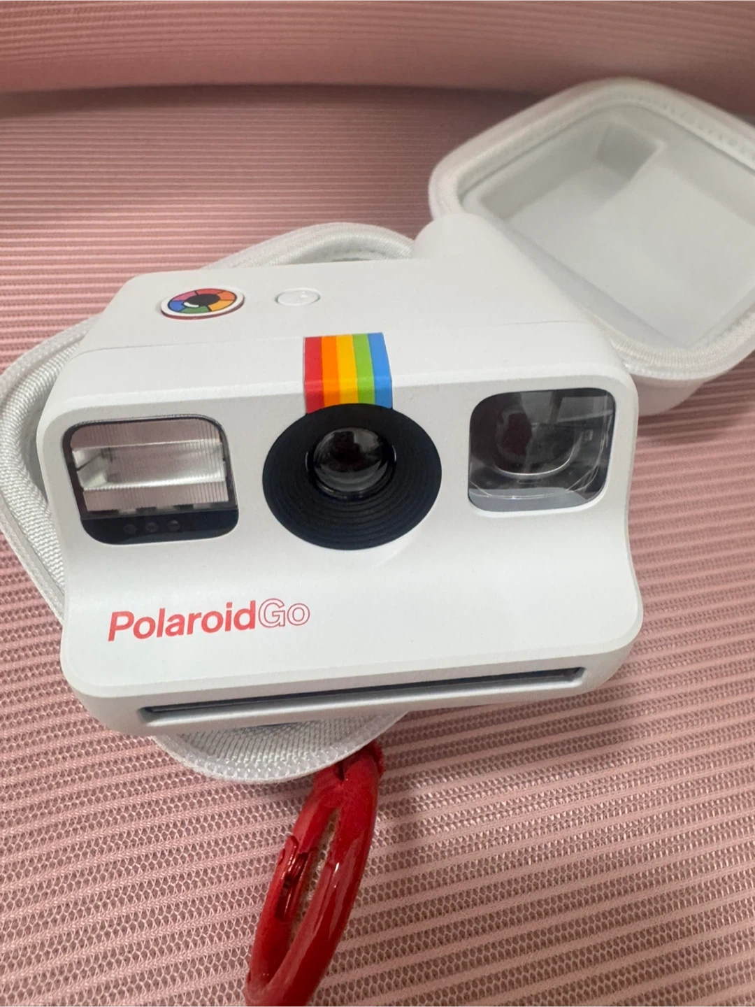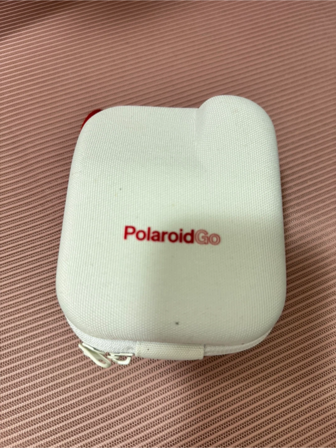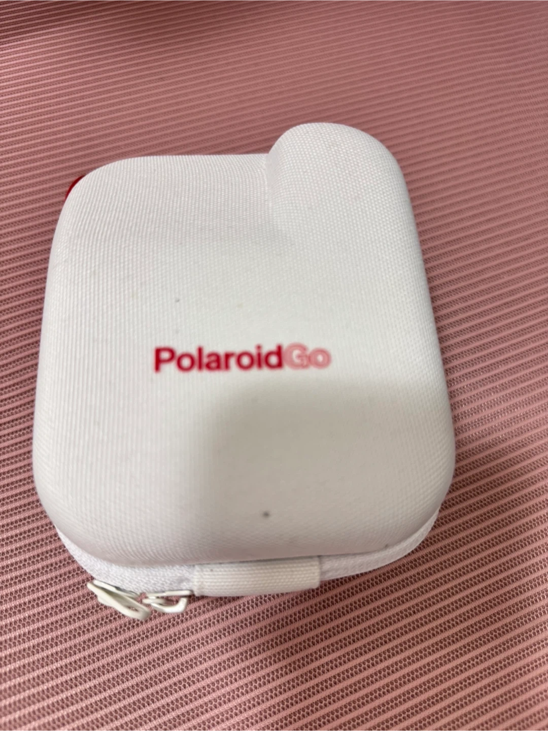 This is a white Polaroid Go instant camera. It comes with a protective zippered case. It's a compact camera for instant photos!