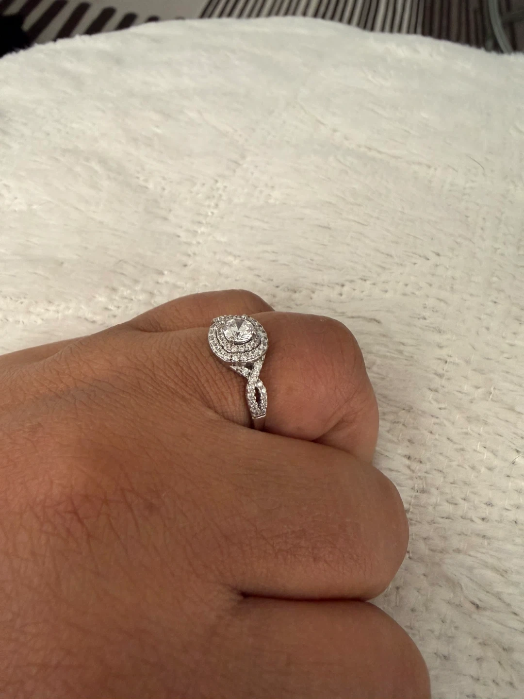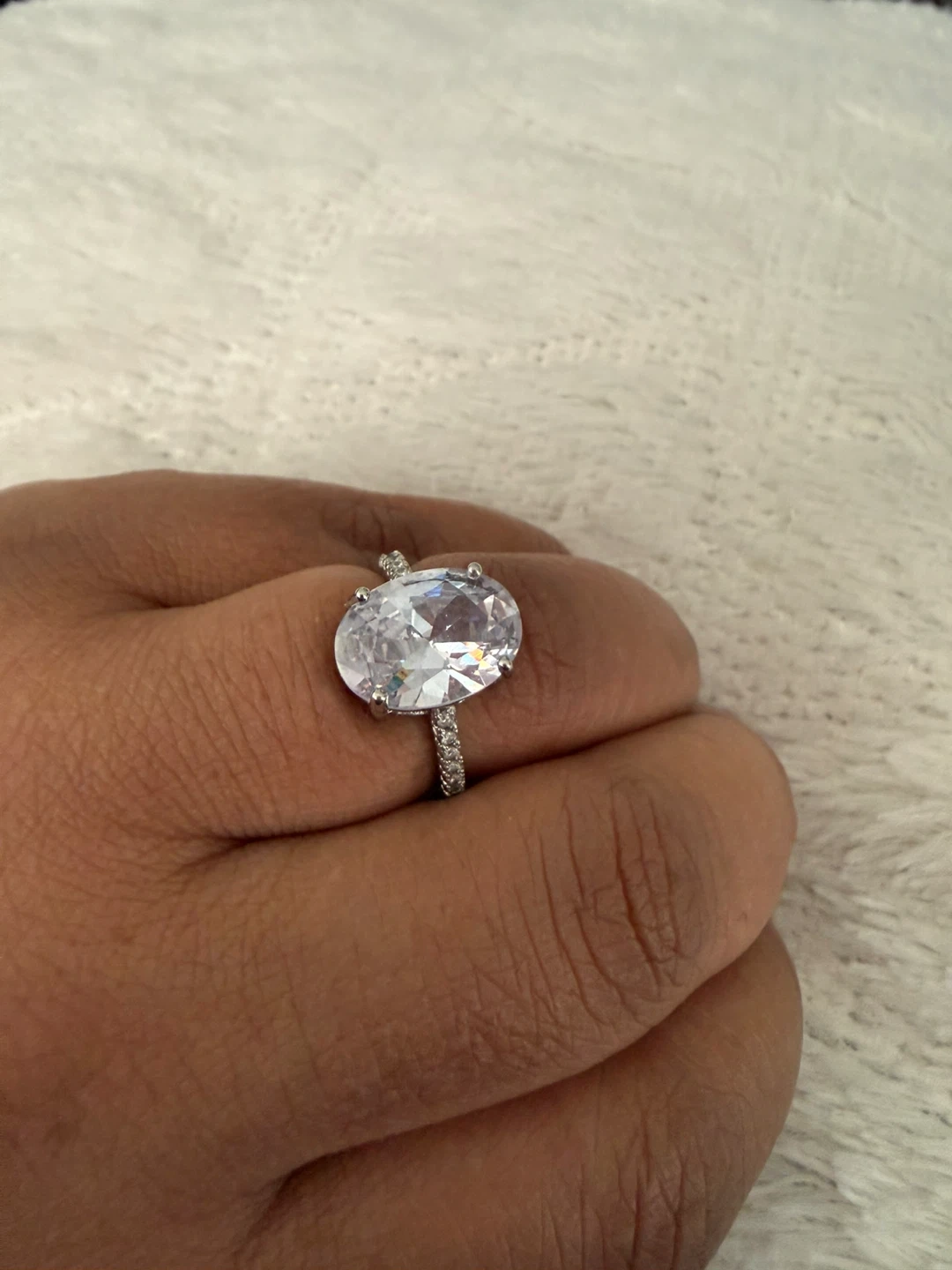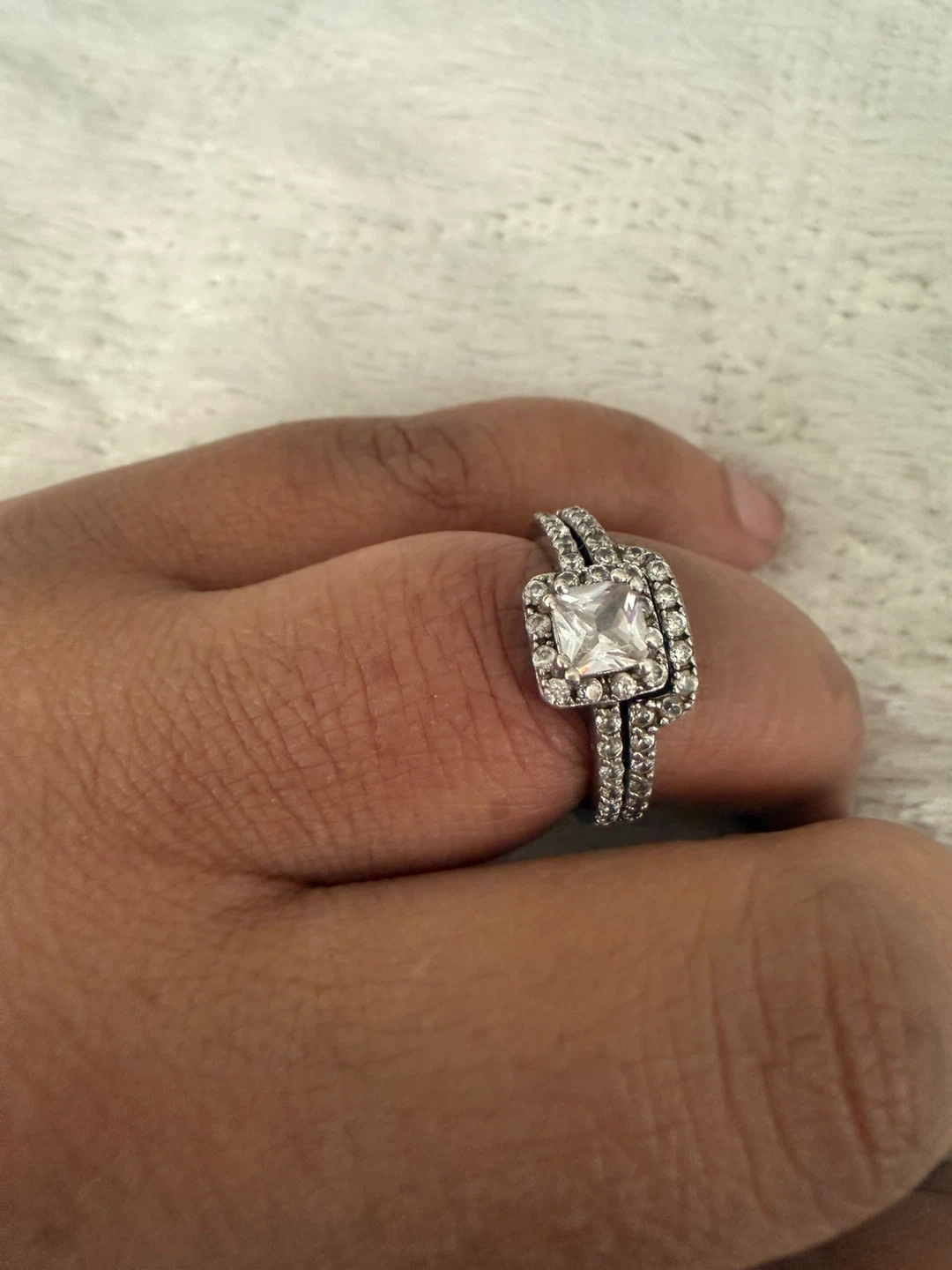 This set includes a large oval-cut centre stone ring with pave detailing on the band, and a wide band ring covered in small stones. Both rings are silver-toned metal with clear, sparkly stones.