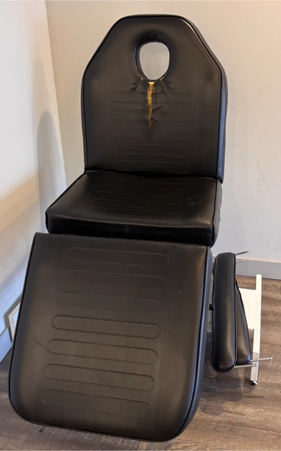 Adjustable black massage table with a removable face cradle. It's made of durable faux leather and features a padded seat and backrest. The table is sturdy and suitable for professional use.