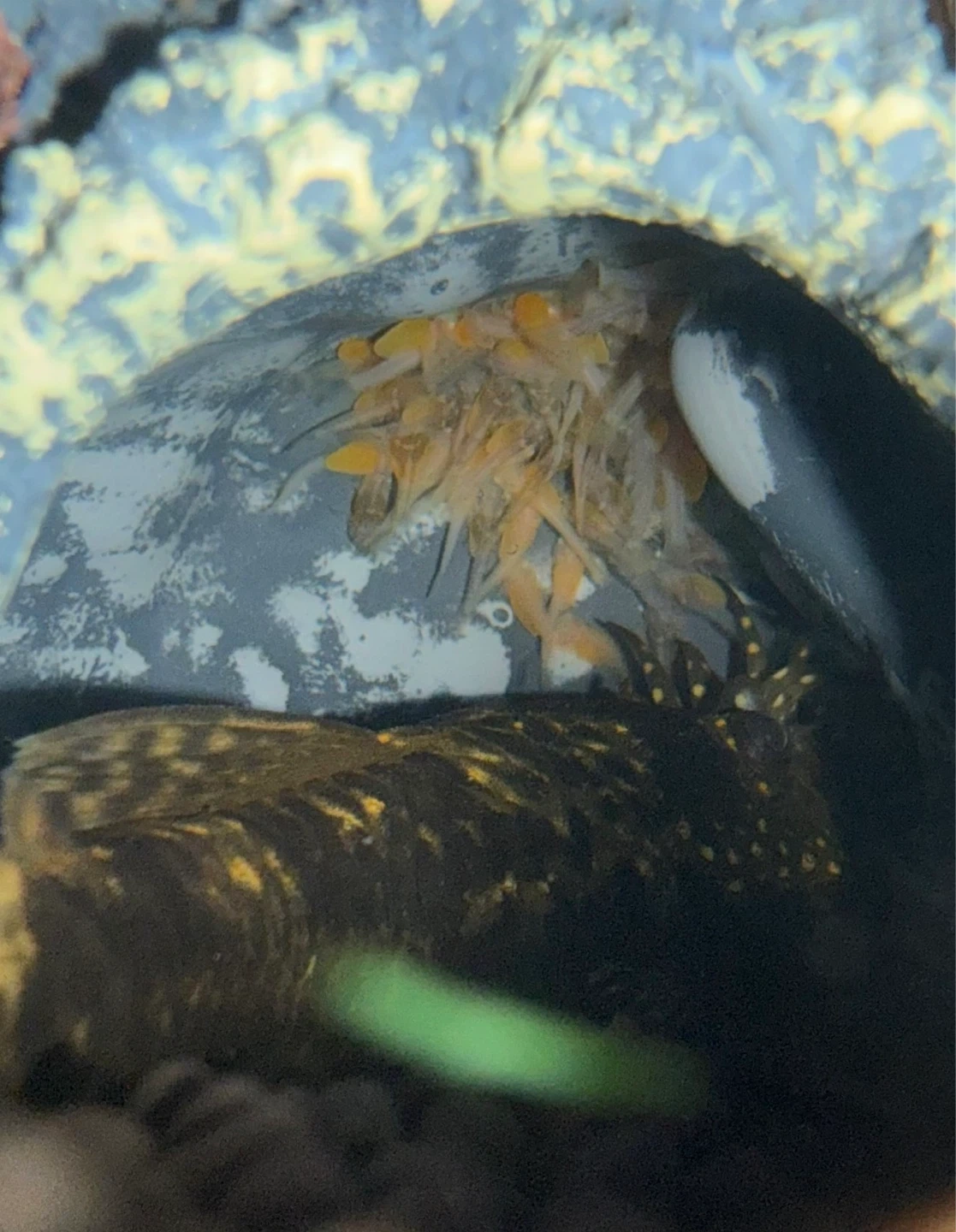 • Eating algae wafers, veggies, and leftover food