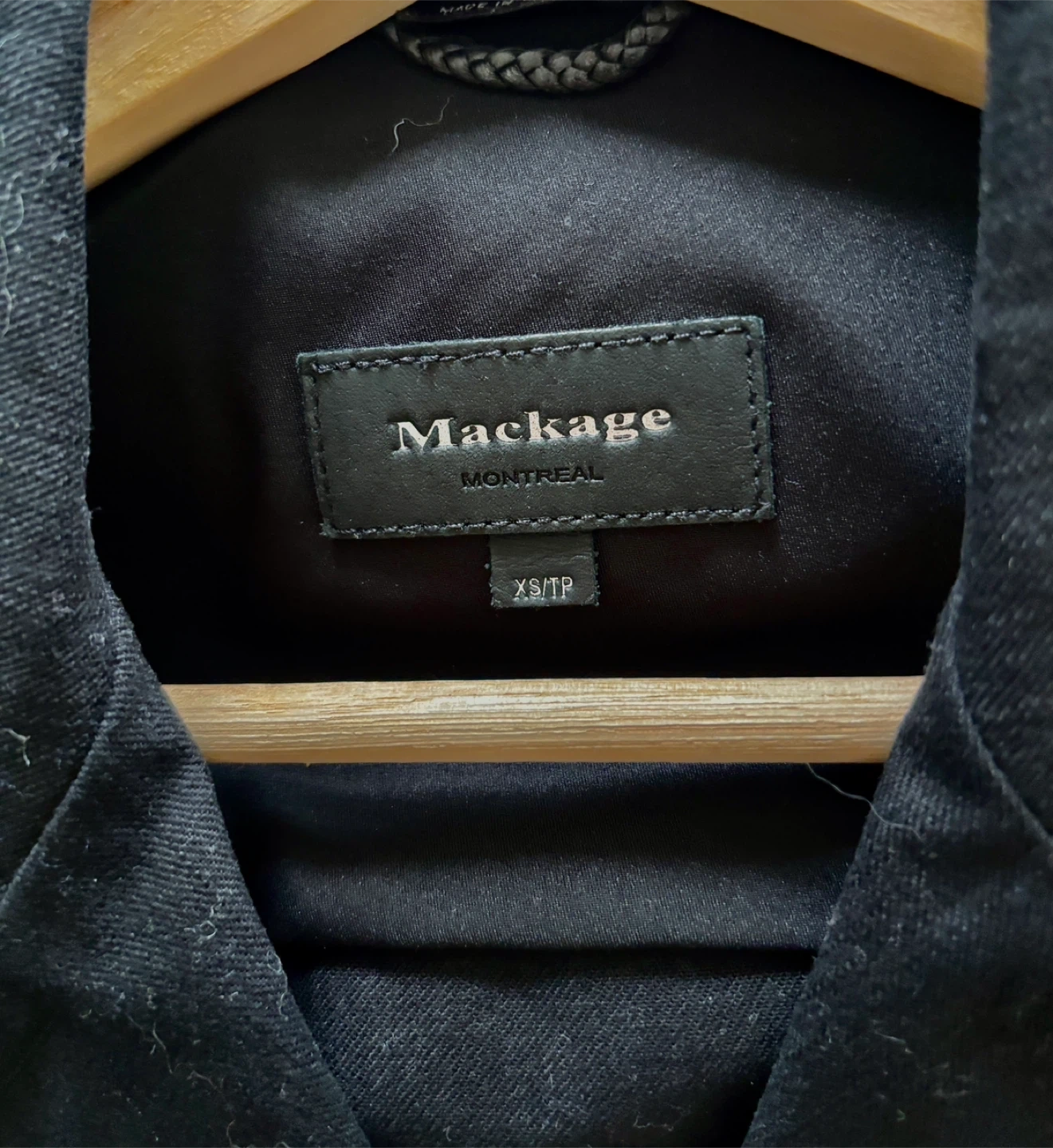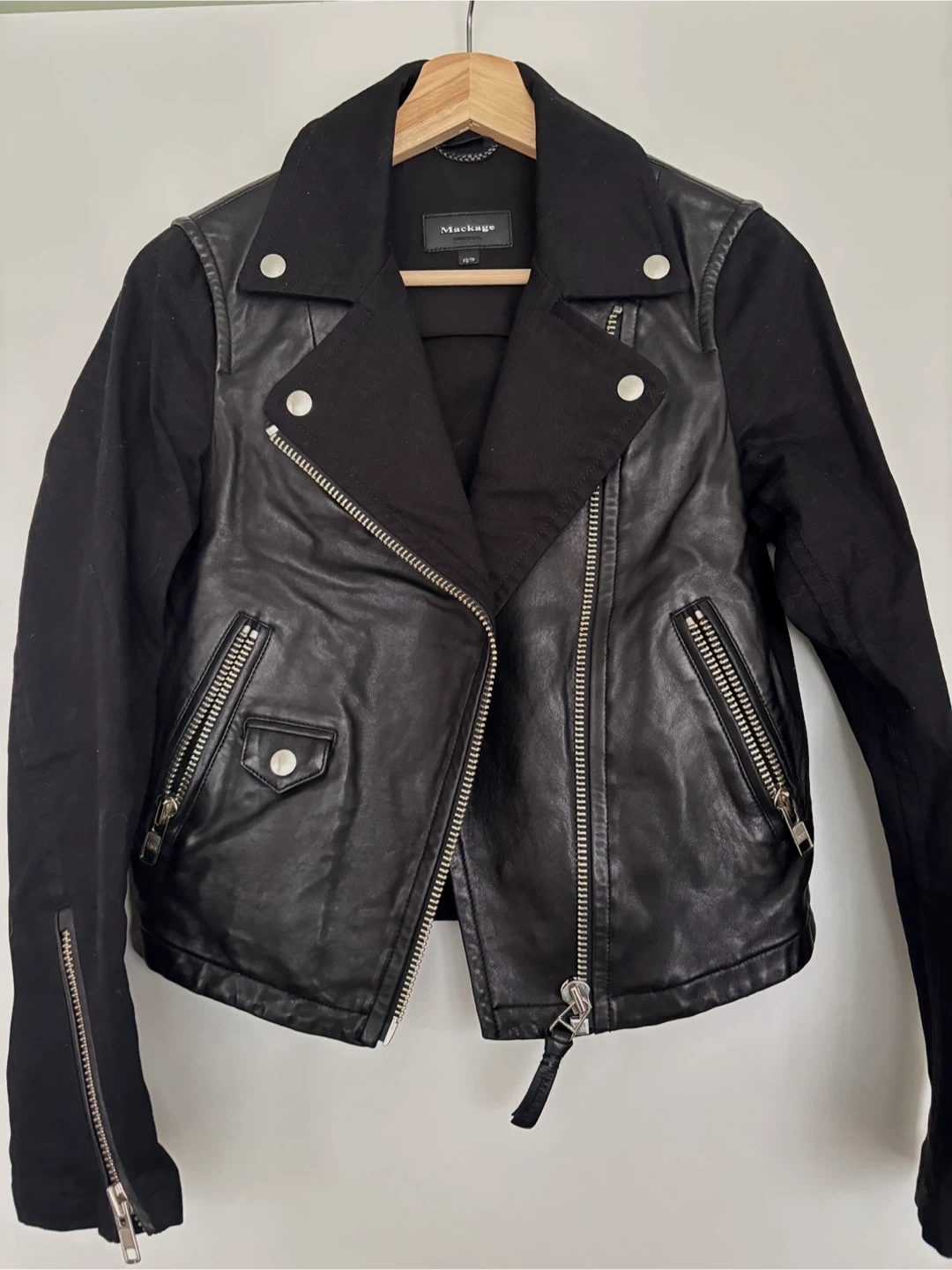 Mackage black leather jacket in size XS. This stylish jacket is perfect for adding an edgy touch to any outfit. It's in great condition and ready for a new home!