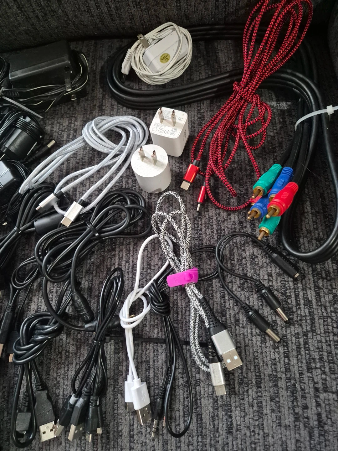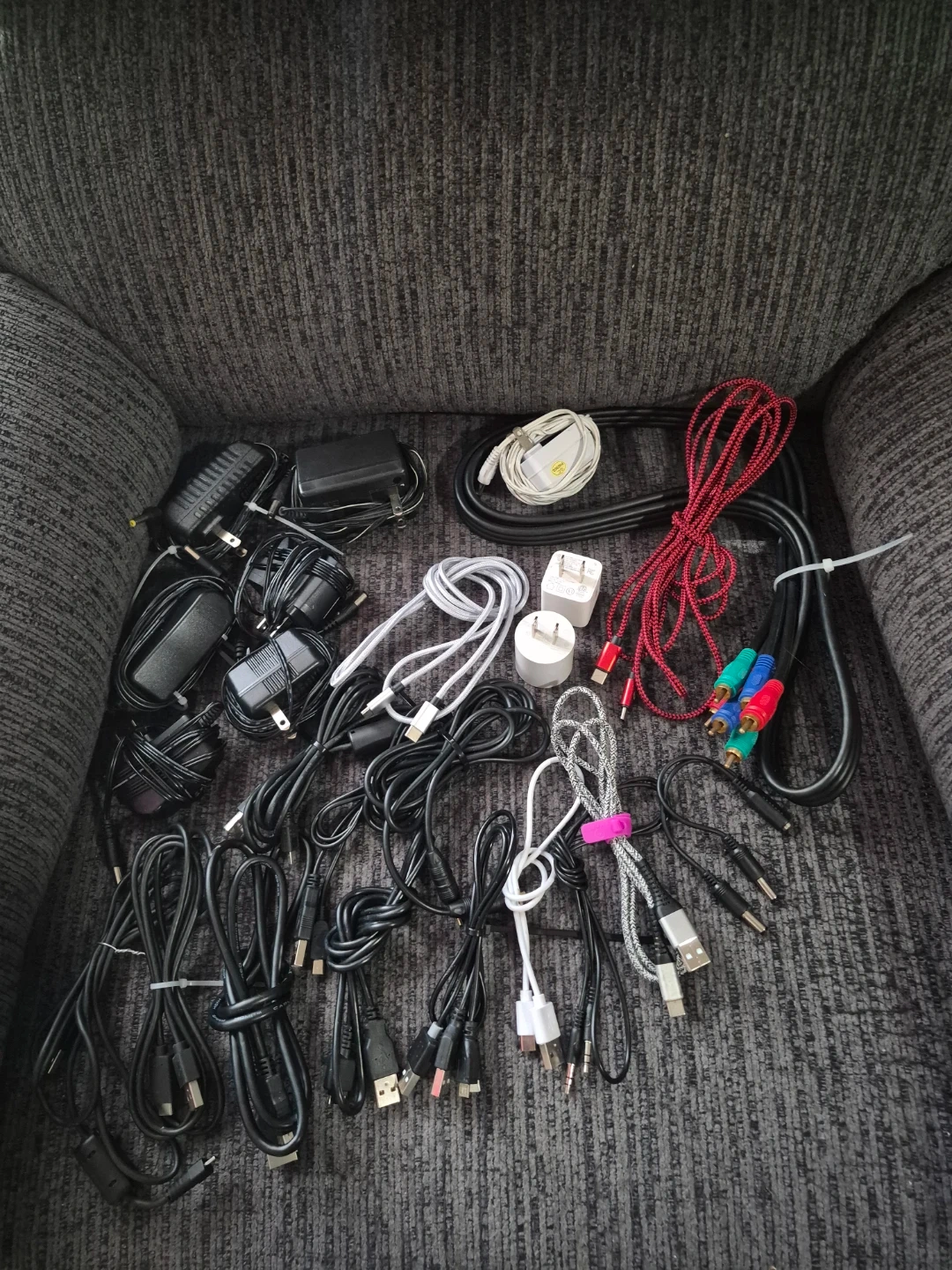 A collection of various charging cables, USB cords, and power adapters. Includes USB-A, USB-C, and audio-visual cables. Great for keeping all your devices connected!