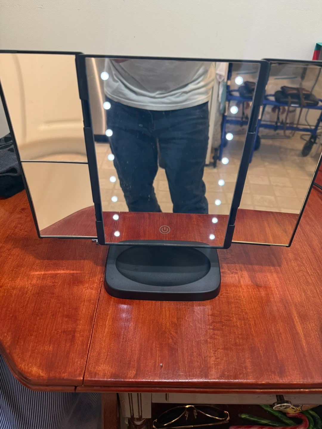 This QUO Beauty tri-fold mirror offers 1x and 3x magnification for detailed tasks. It's equipped with LED lighting with three different brightness settings. A great mirror for makeup application or grooming!Comes with brand new batteries as still like new .