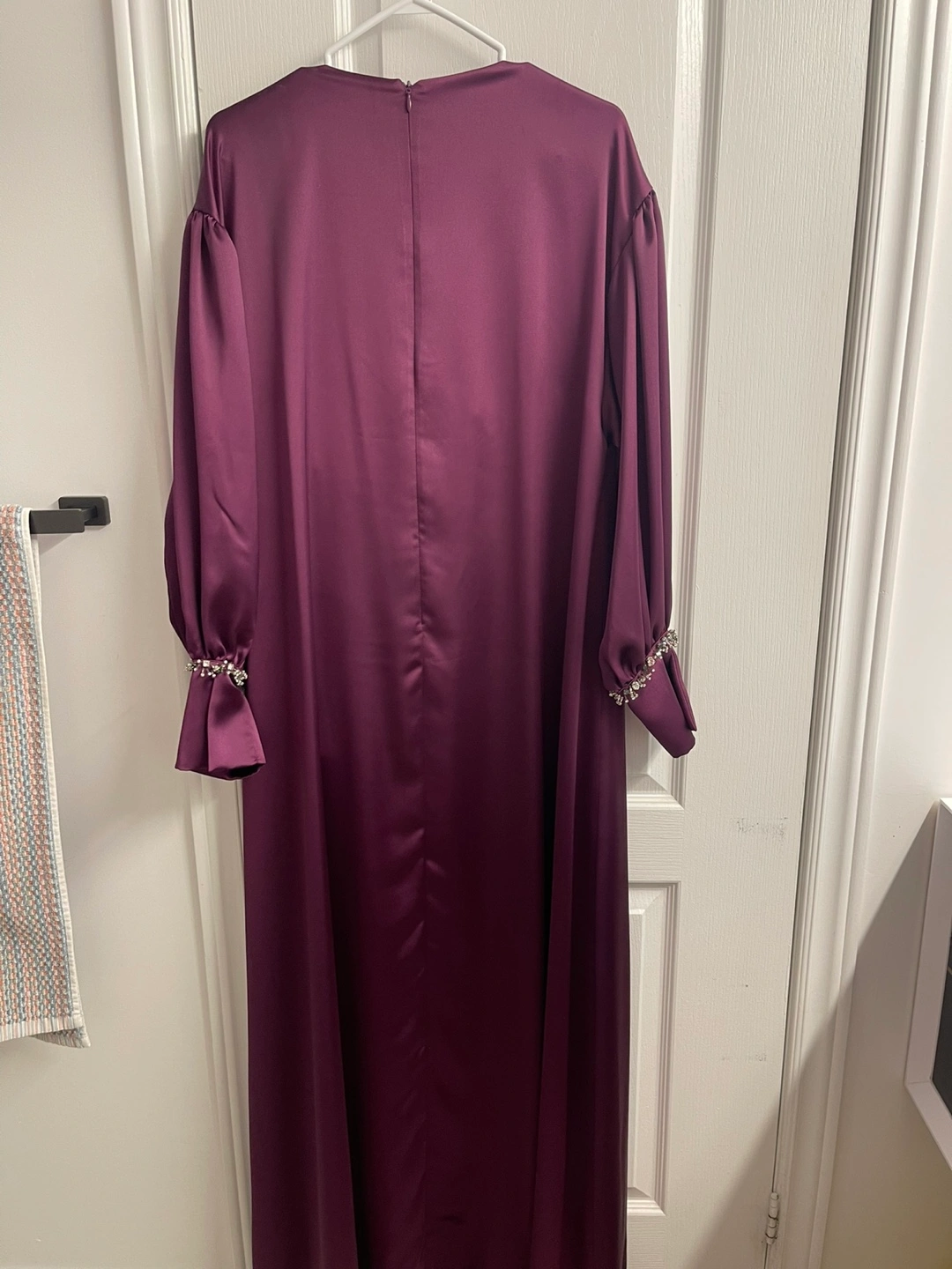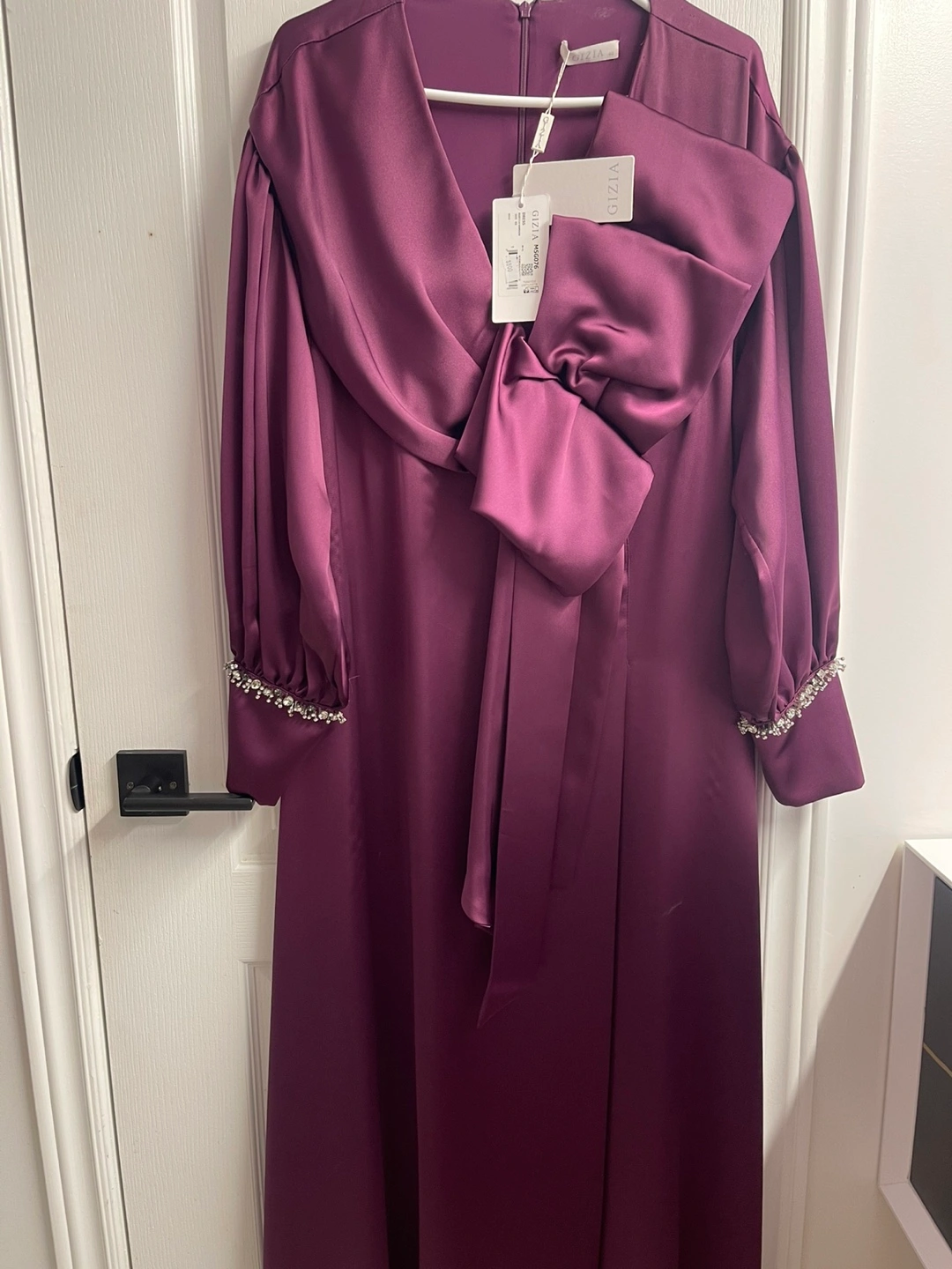 Gorgeous purple satin midi dress. Features long sleeves with embellished cuffs and a large bow at the waist.Brand new