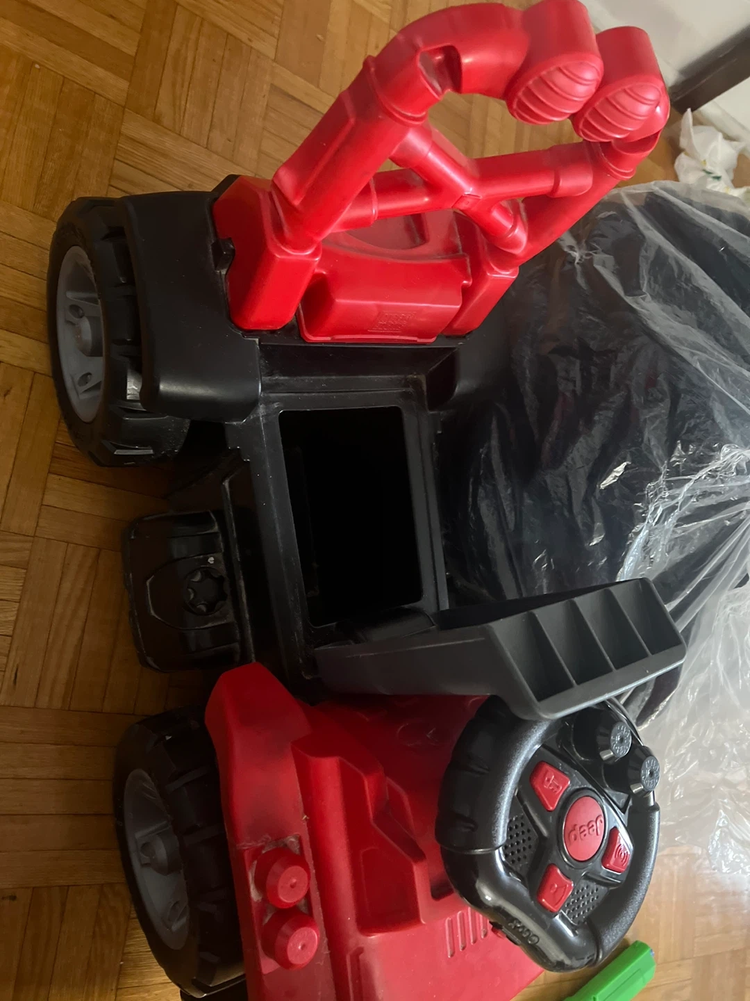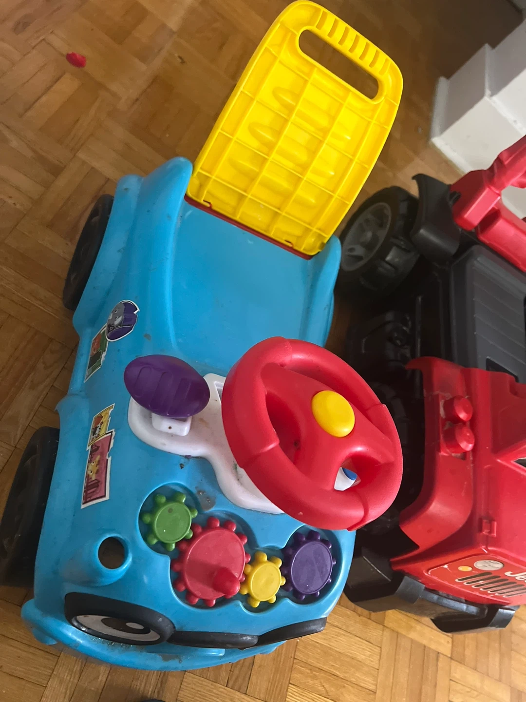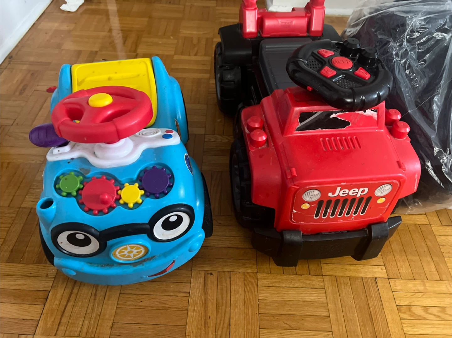 Red Jeep ride-on toy car with steering wheel and buttons. Also includes a blue ride-on toy car with gears and steering wheel. Plastic construction. It's a fun toy for toddlers!