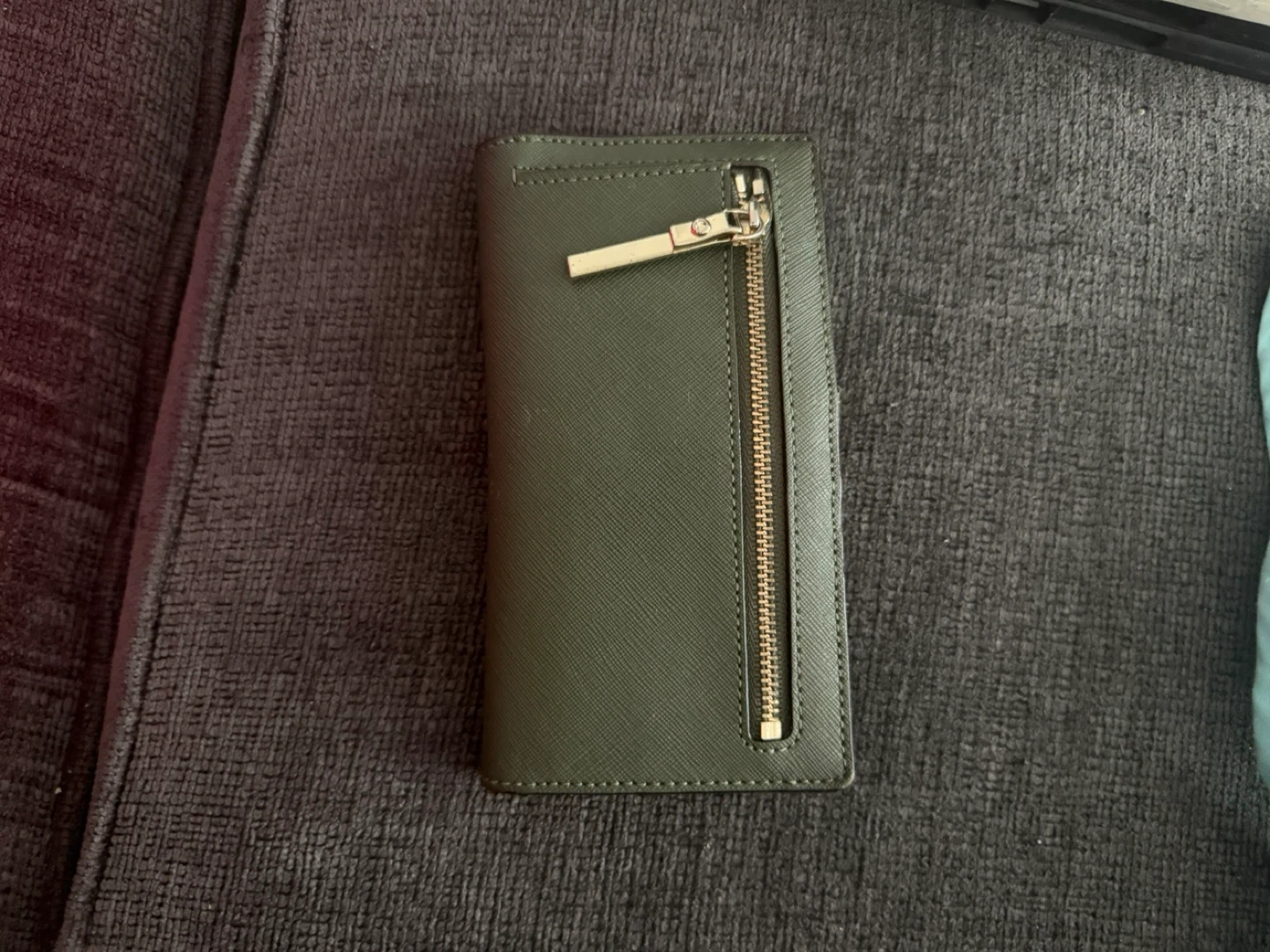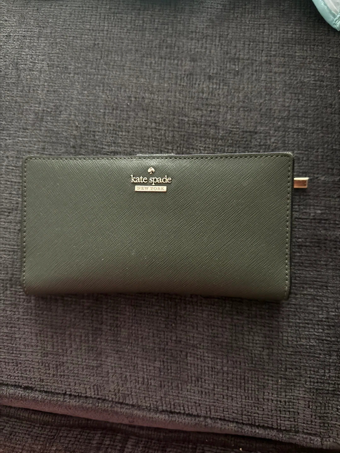 This is a Kate Spade wallet in a deep green colour. It's made of Saffiano leather and has multiple card slots and a zip pocket. This wallet is perfect for keeping your essentials organized.