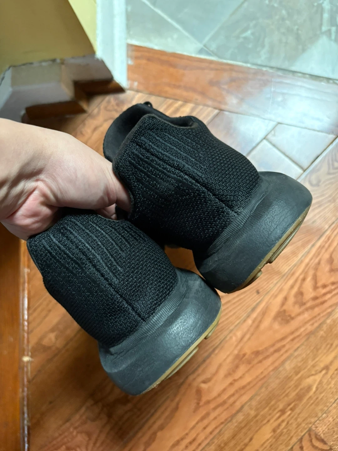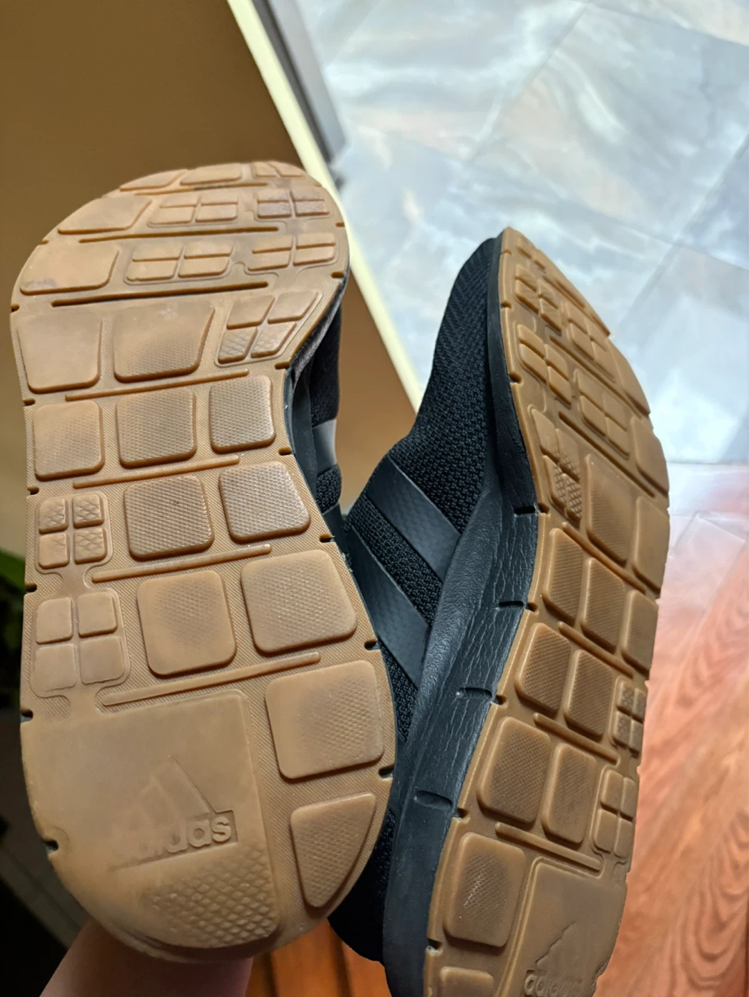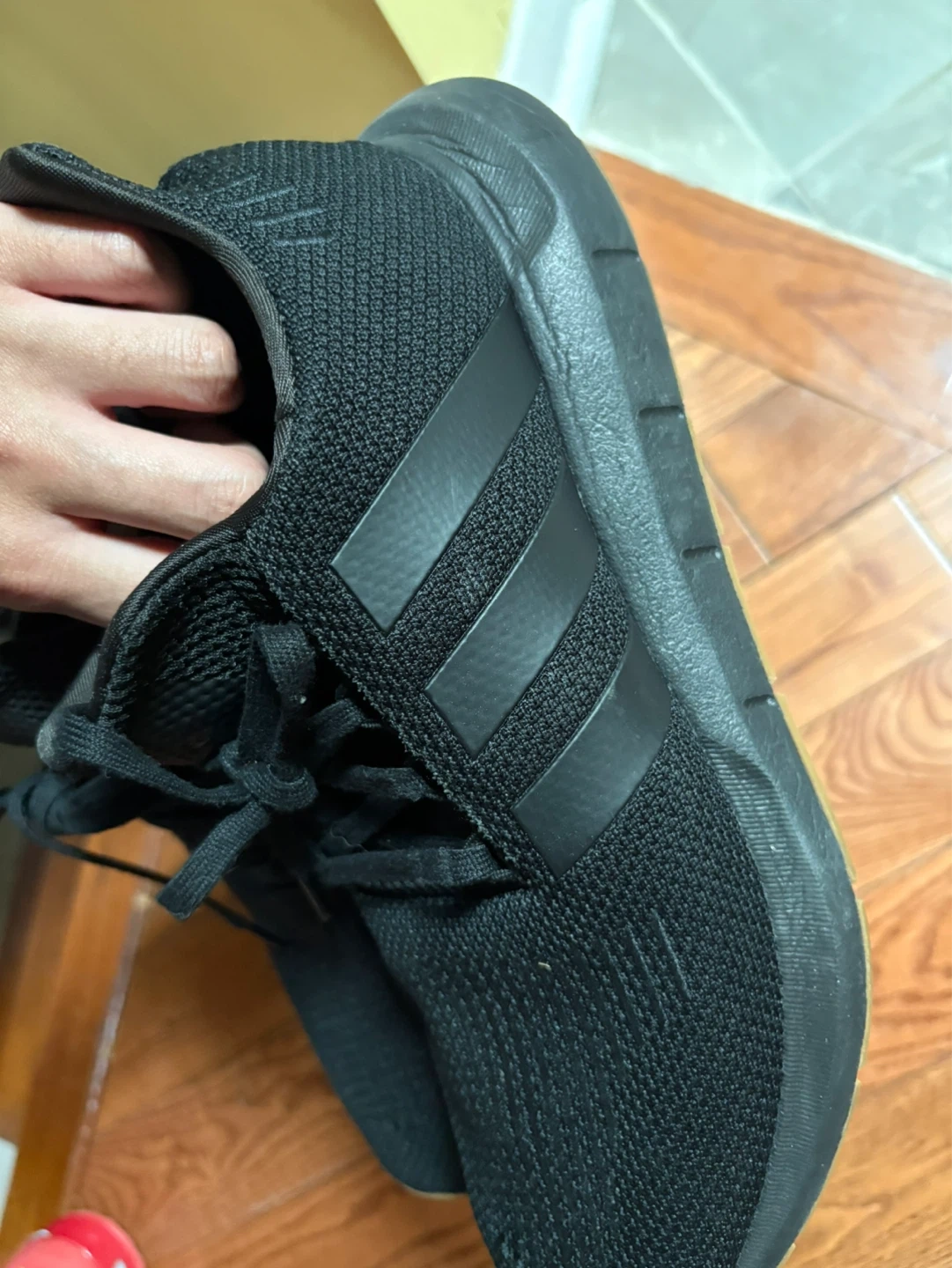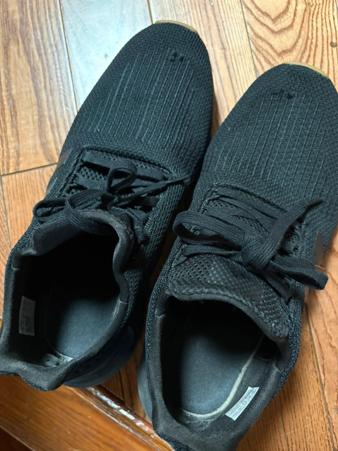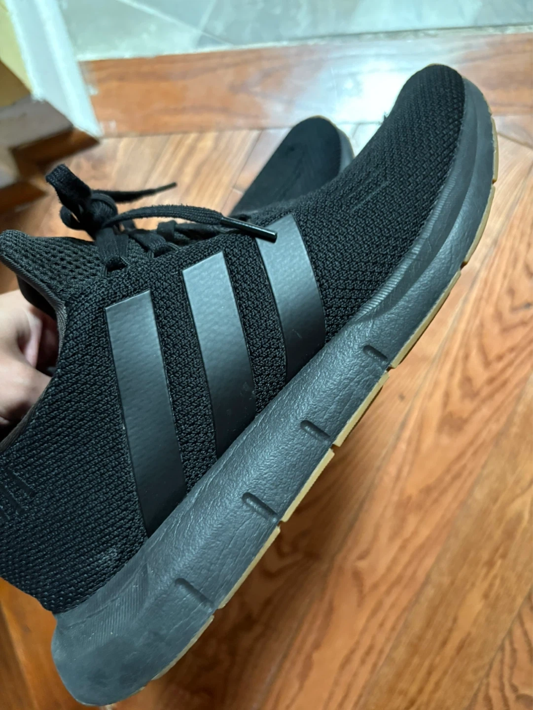 Adidas Swift Run shoes in black. These sneakers are a size 10 (US Men's). They're made from a breathable mesh material with a durable rubber sole. Perfect for everyday wear or light athletic activities.