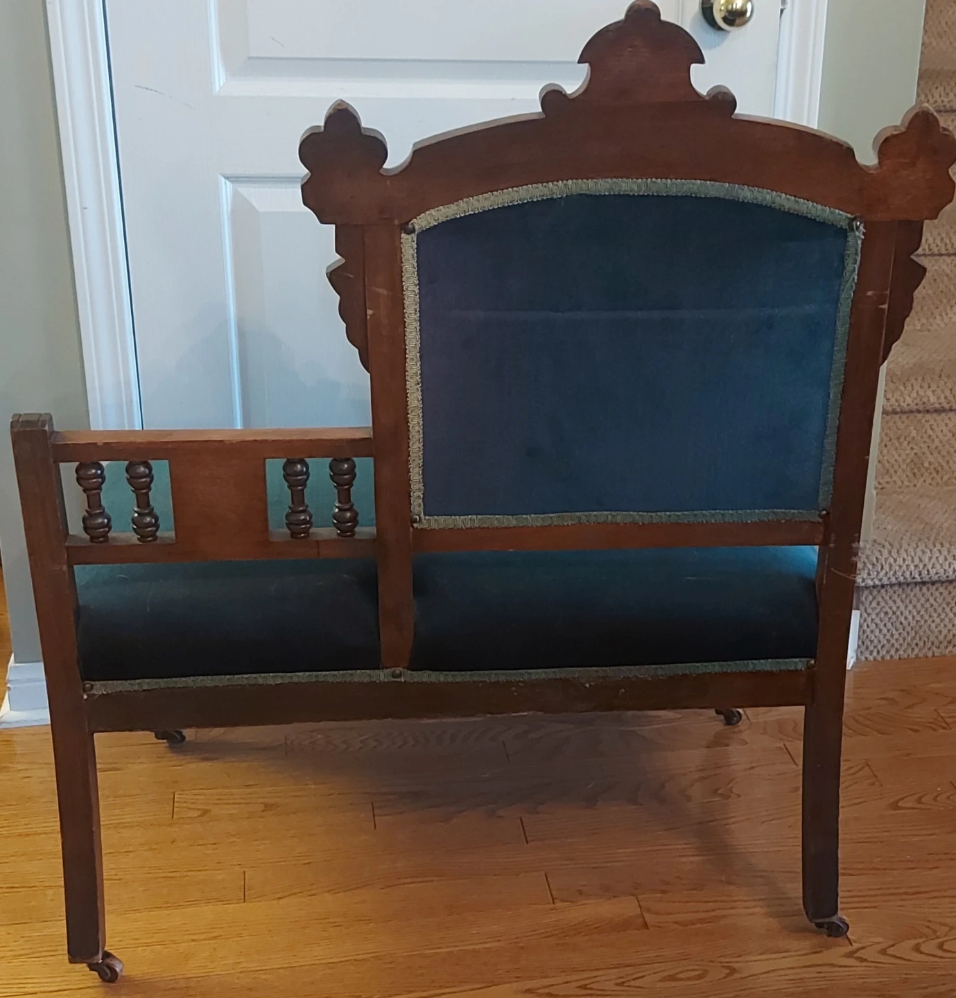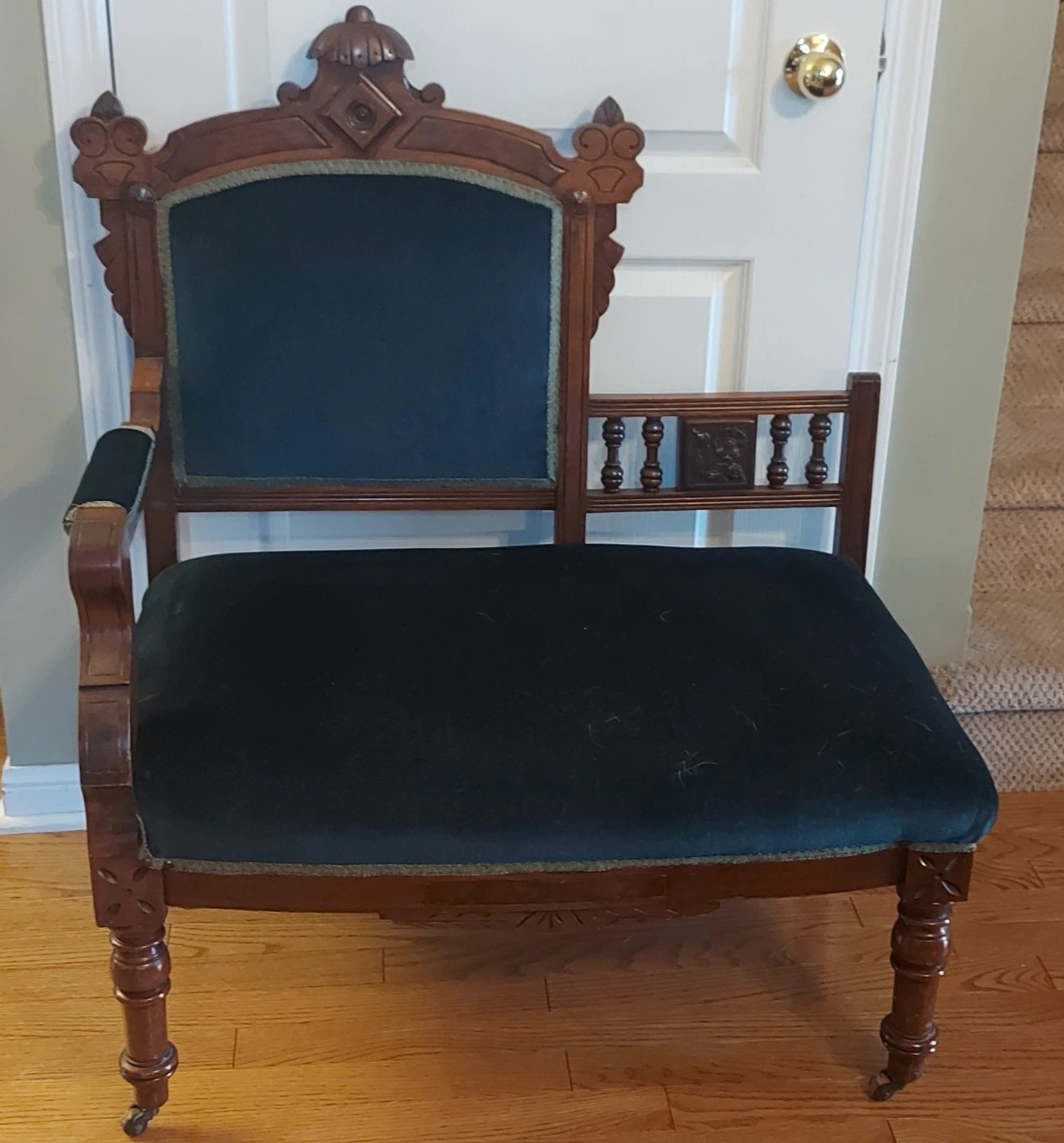 This is a beautifully crafted antique accent chair. It's made of dark wood with green velvet upholstery. The chair features ornate carvings and decorative trim. Great for adding a vintage touch to any room!