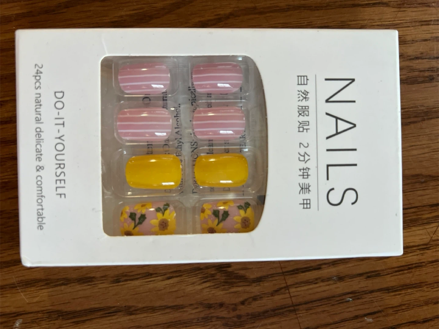 Set of 24 faux nails in various designs including pink stripes, yellow, and floral patterns. Includes glue for application. Great for a quick manicure change!