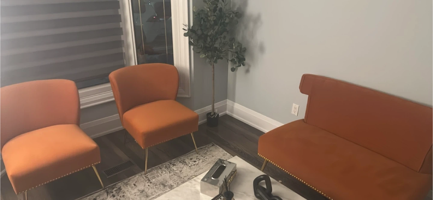This stylish accent chair features a vibrant orange velvet upholstery and elegant gold metal legs. It's designed with a supportive back and studded trim for a touch of sophistication. Add a pop of colour and comfort to any room!