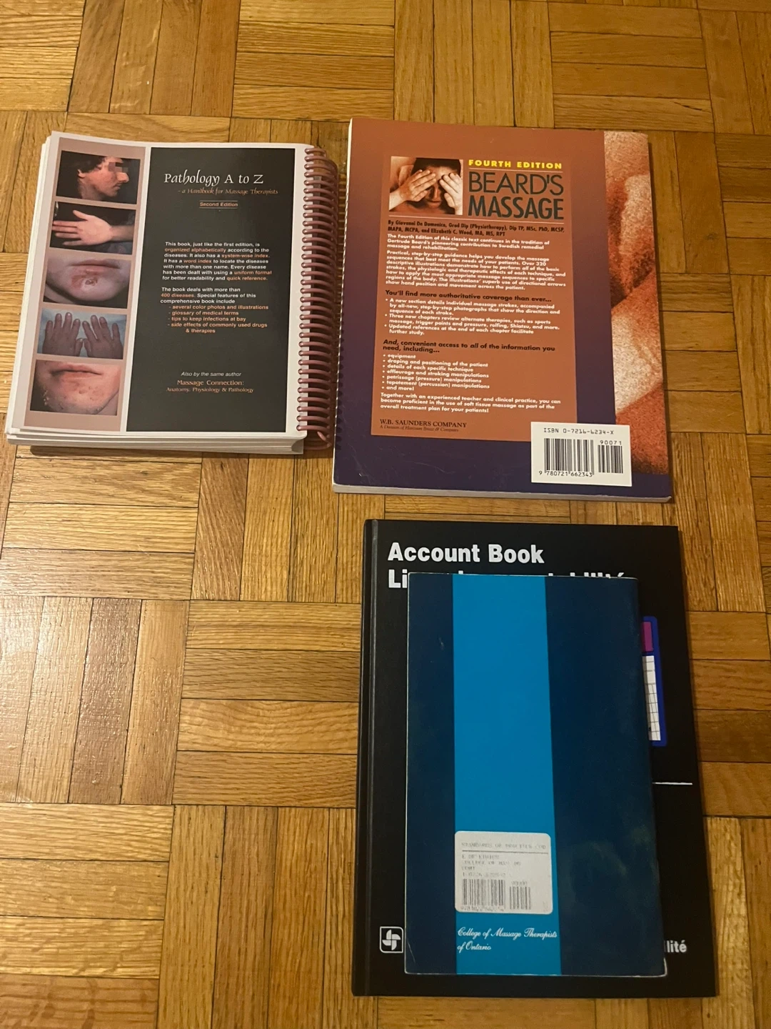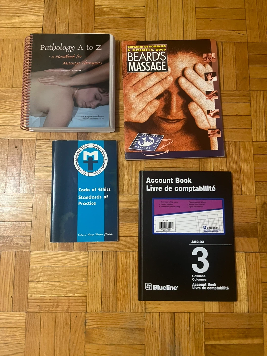 Bundle includes 'Pathology A to Z - A Handbook for Massage Therapists', 'Beard's Massage' (Fourth Edition), 'Code of Ethics Standards of Practice' from the College of Massage Therapists of Ontario, and a Blueline 3-column account book. These resources are ideal for students or practitioners in massage therapy and accounting.