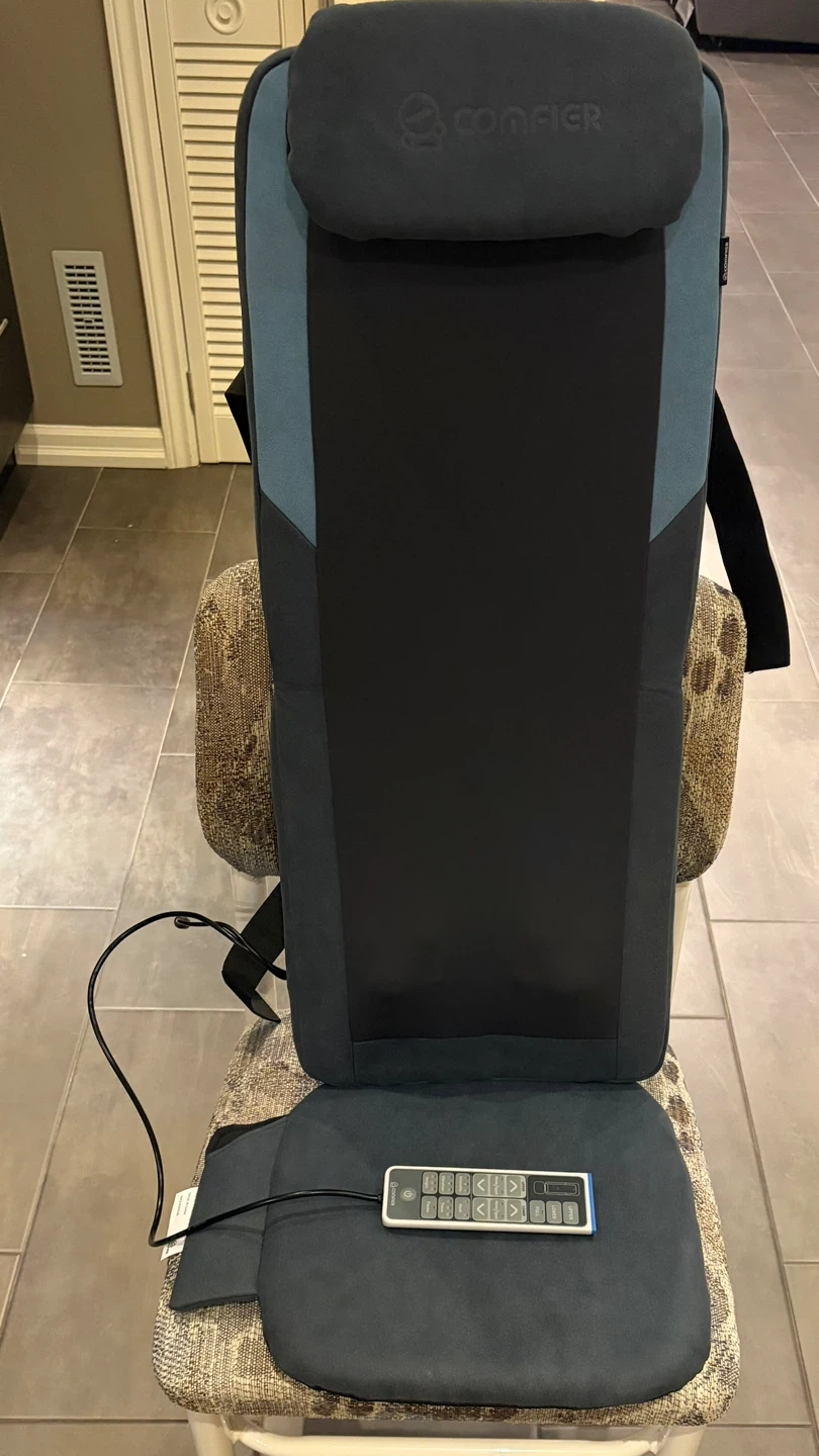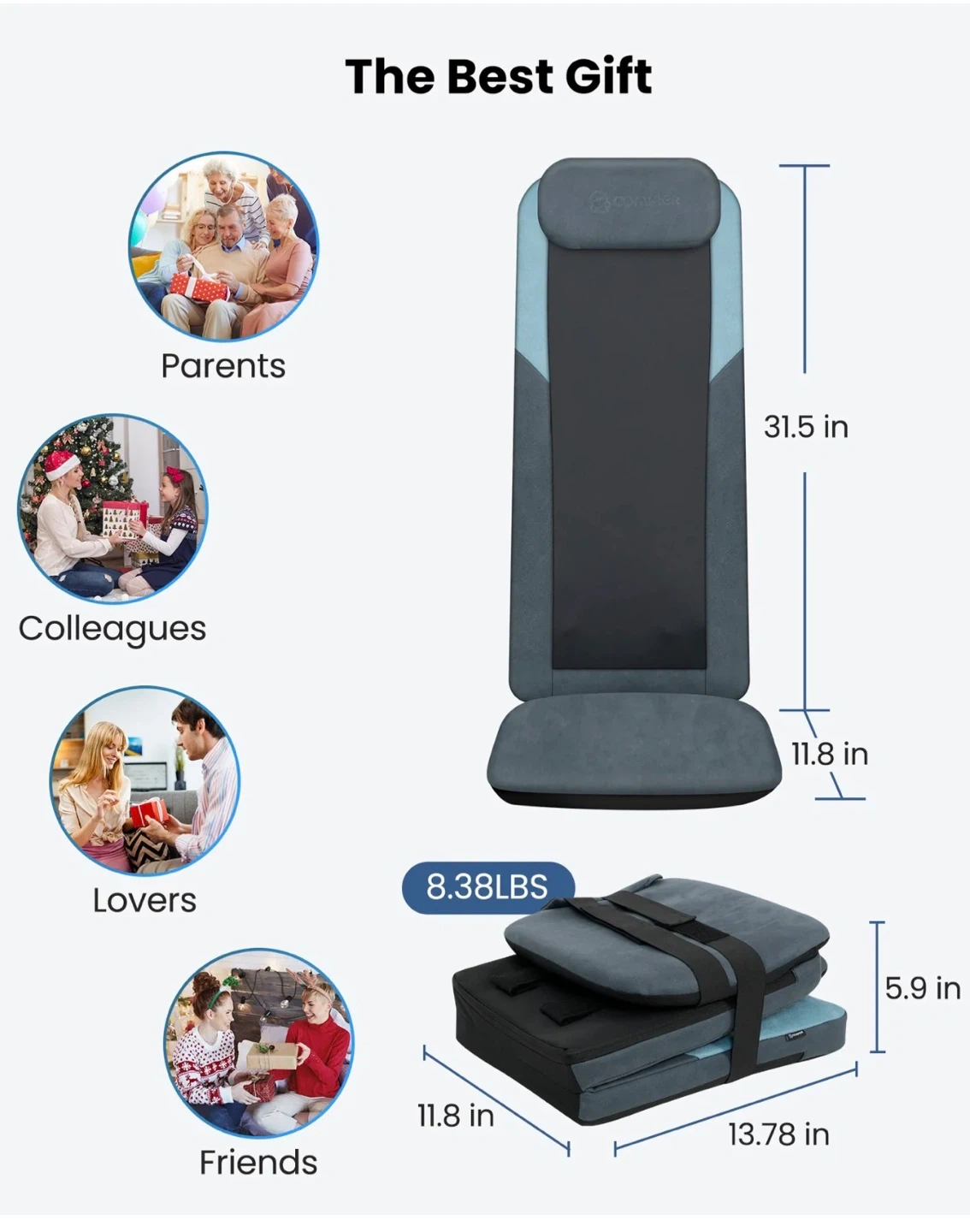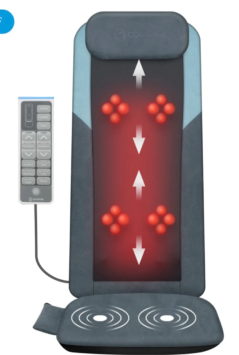 This Comfier massage seat cushion offers a full back massage with heat. It includes a remote for customized settings. The cushion is 31.5 inches long and weighs 8.38 lbs. It's great for relieving muscle tension after a long day.