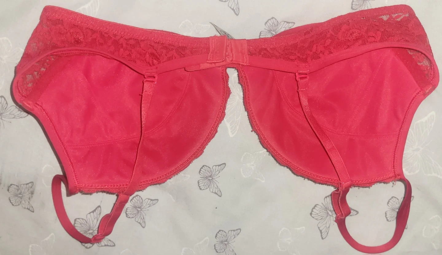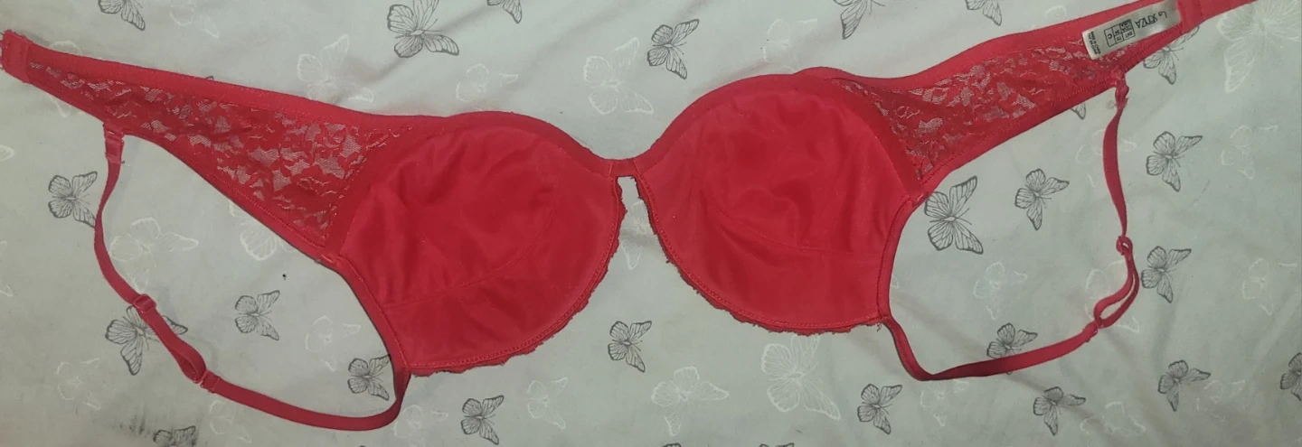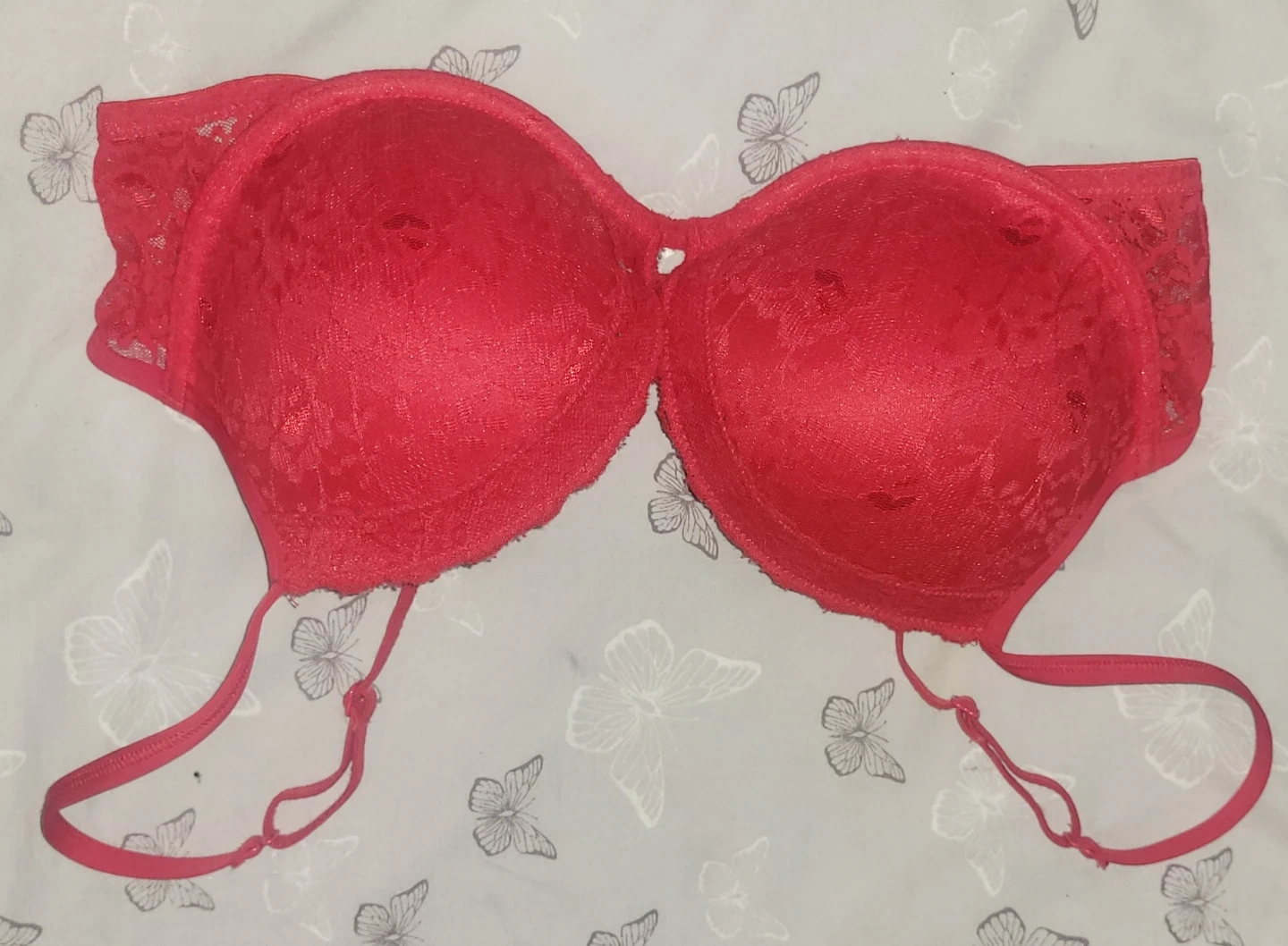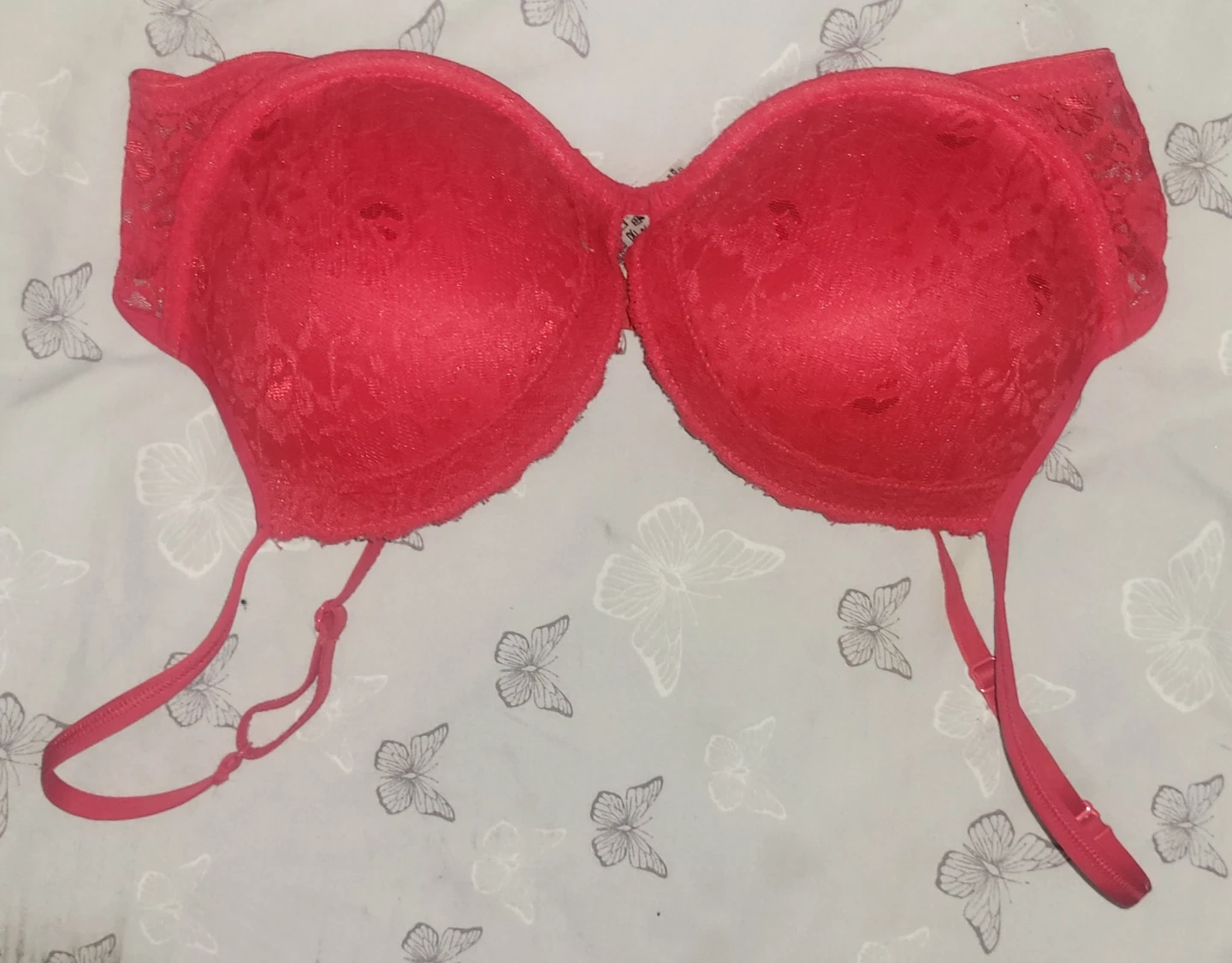 This is a red push-up bra with lace detailing. It's a size 34C, made in China. Features adjustable straps and a hook-and-eye closure.