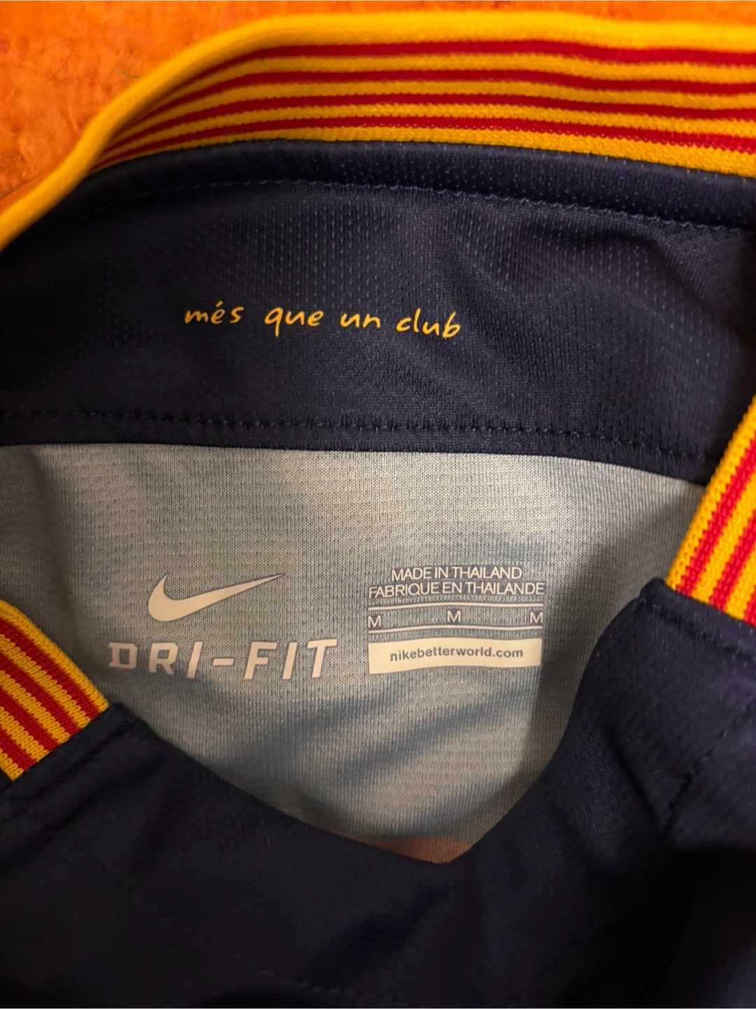 This is a Nike FC Barcelona soccer jersey from the 2015-2016 season. It's made with Dri-FIT fabric for sweat-wicking comfort. The jersey is blue and red with yellow accents and features the club crest and sponsor logos. Size medium.