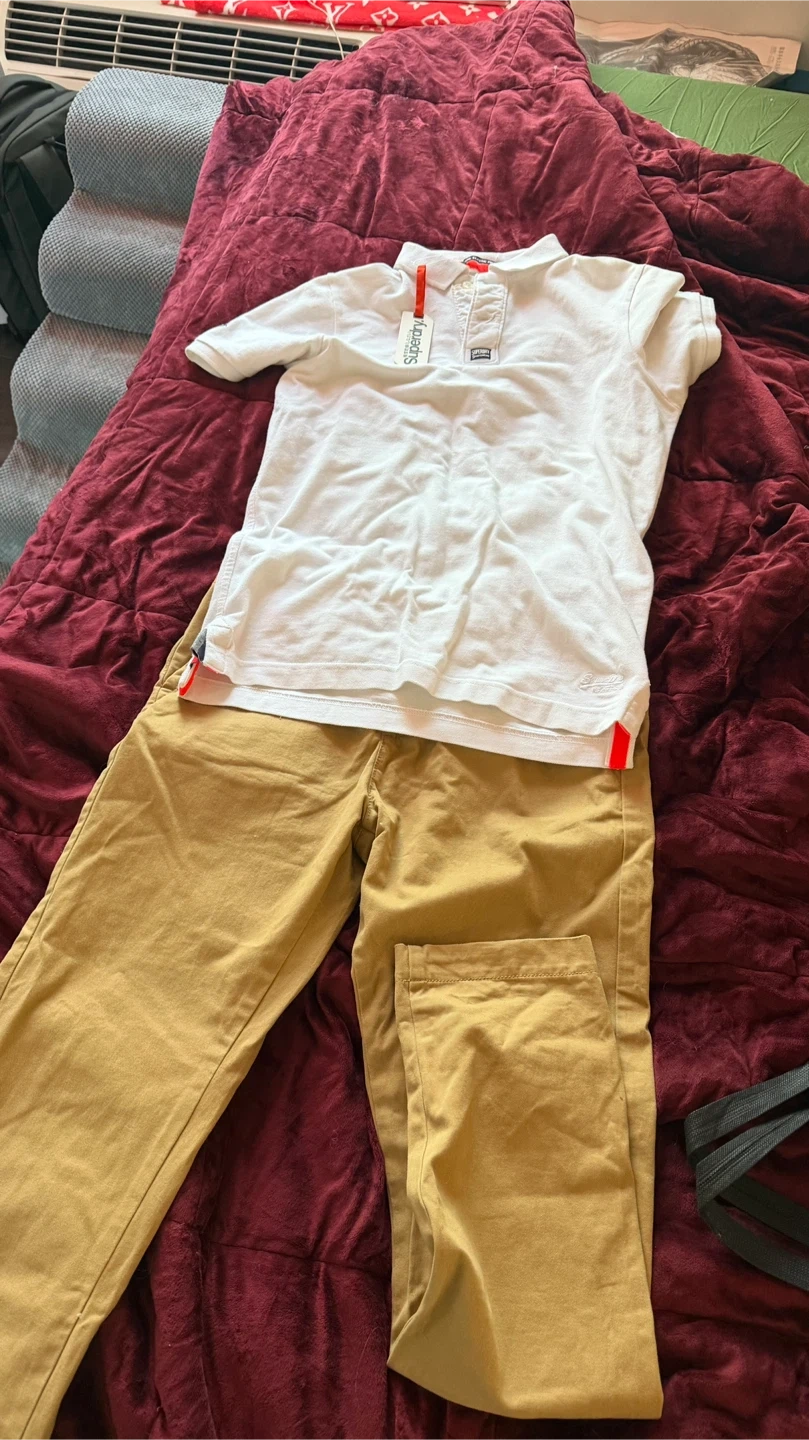 Superdry White Polo Shirt L & Tan Chinos pants set