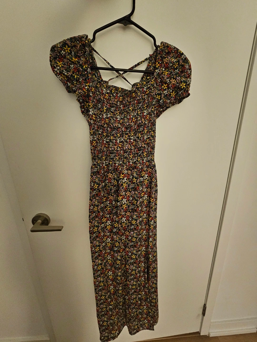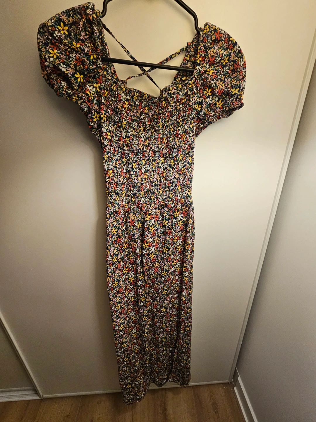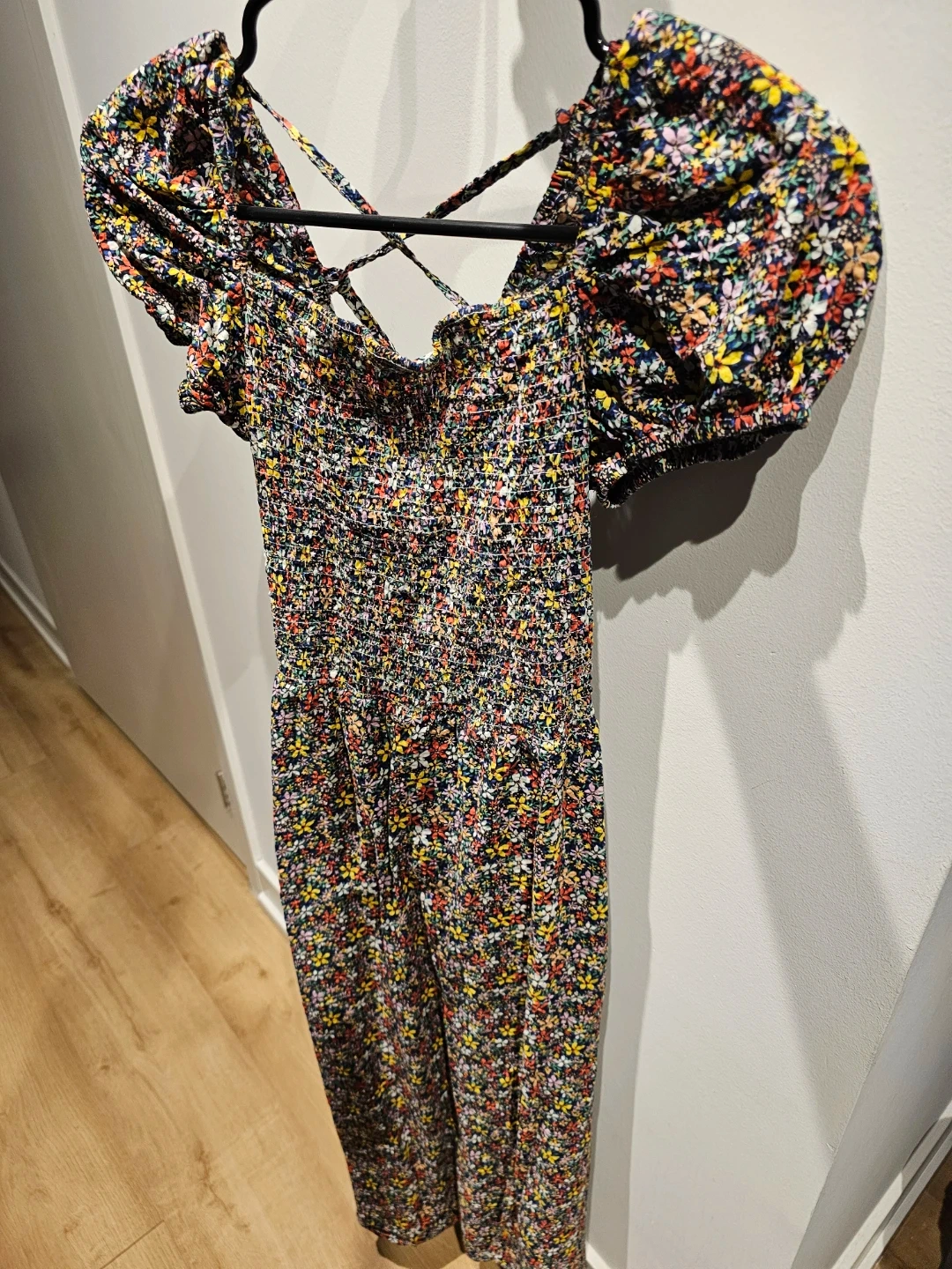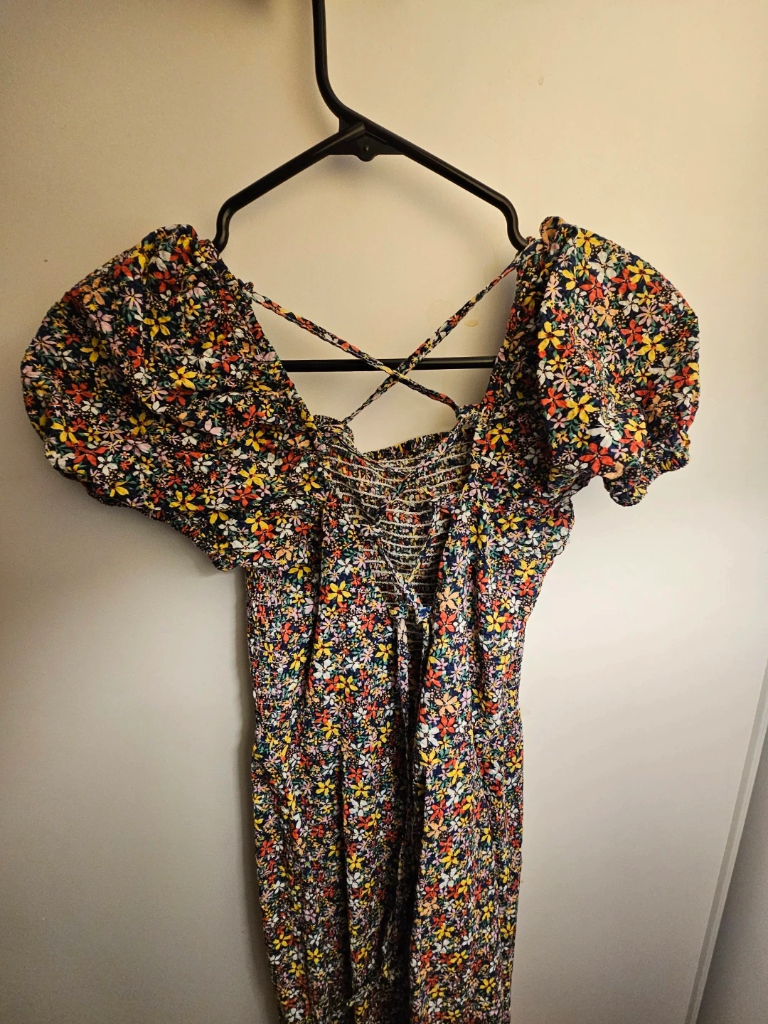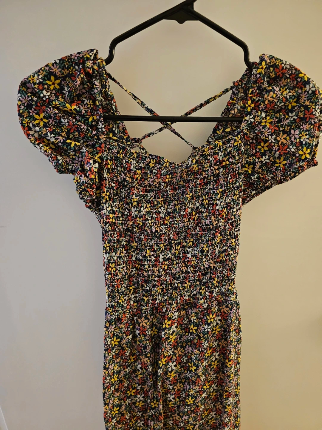 Smocked bodice with a dainty floral print. Features puff sleeves and a criss-cross back detail. This dress has a relaxed fit.