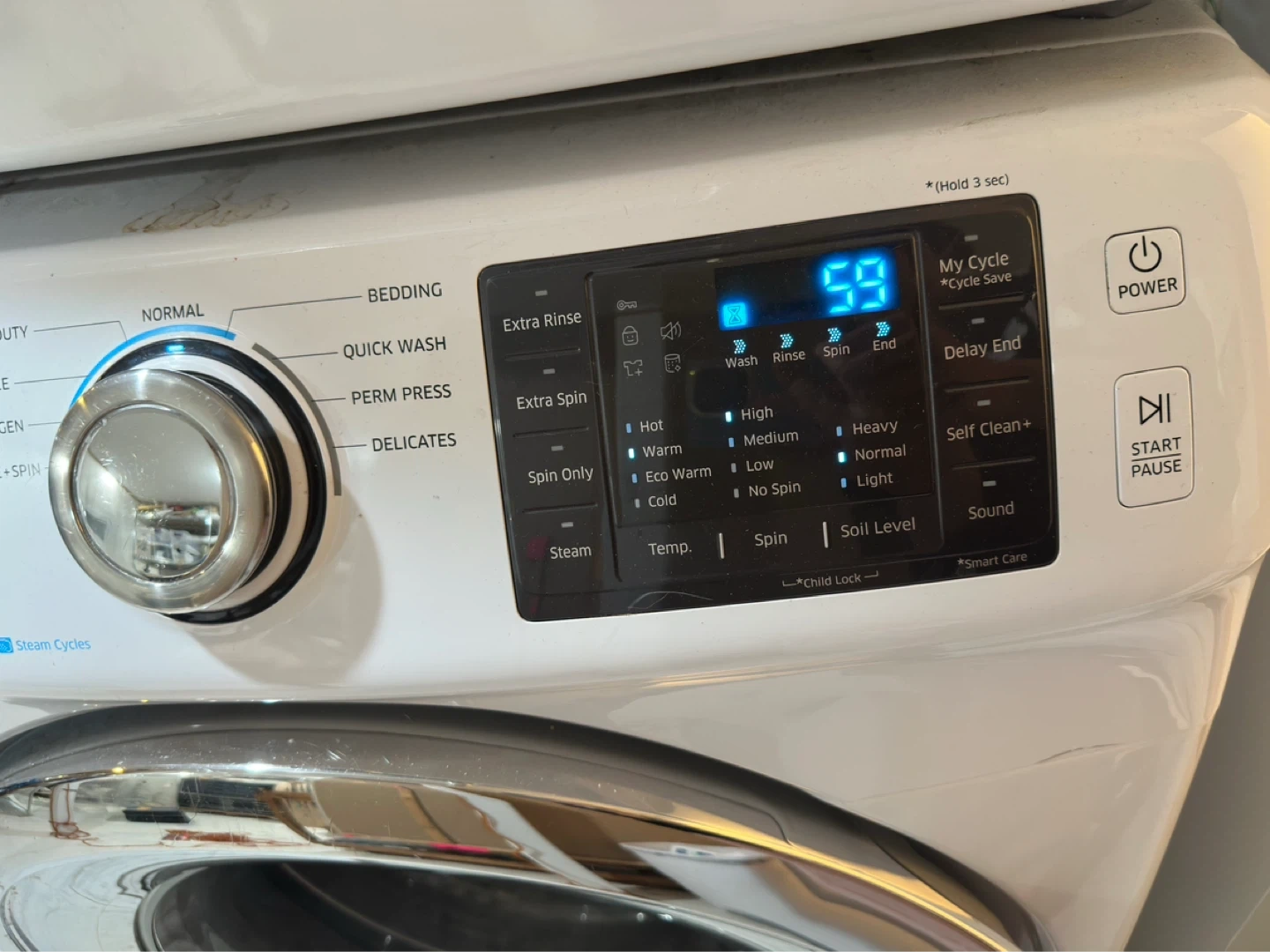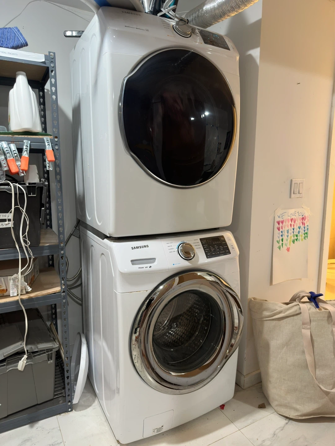 Samsung front-load washer and dryer set. - The washer cycles include Normal, Quick Wash, Perm Press, Delicates, Extra Rinse, and Steam.