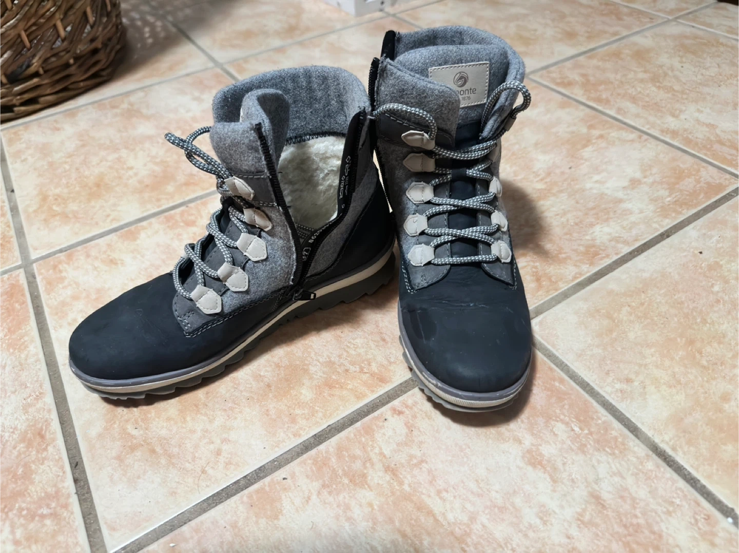 These Remonte winter boots are a stylish grey colour. They feature a cozy wool lining and a side zipper for easy on and off. The outsole is durable rubber. Perfect for keeping your feet warm and dry during the colder months!