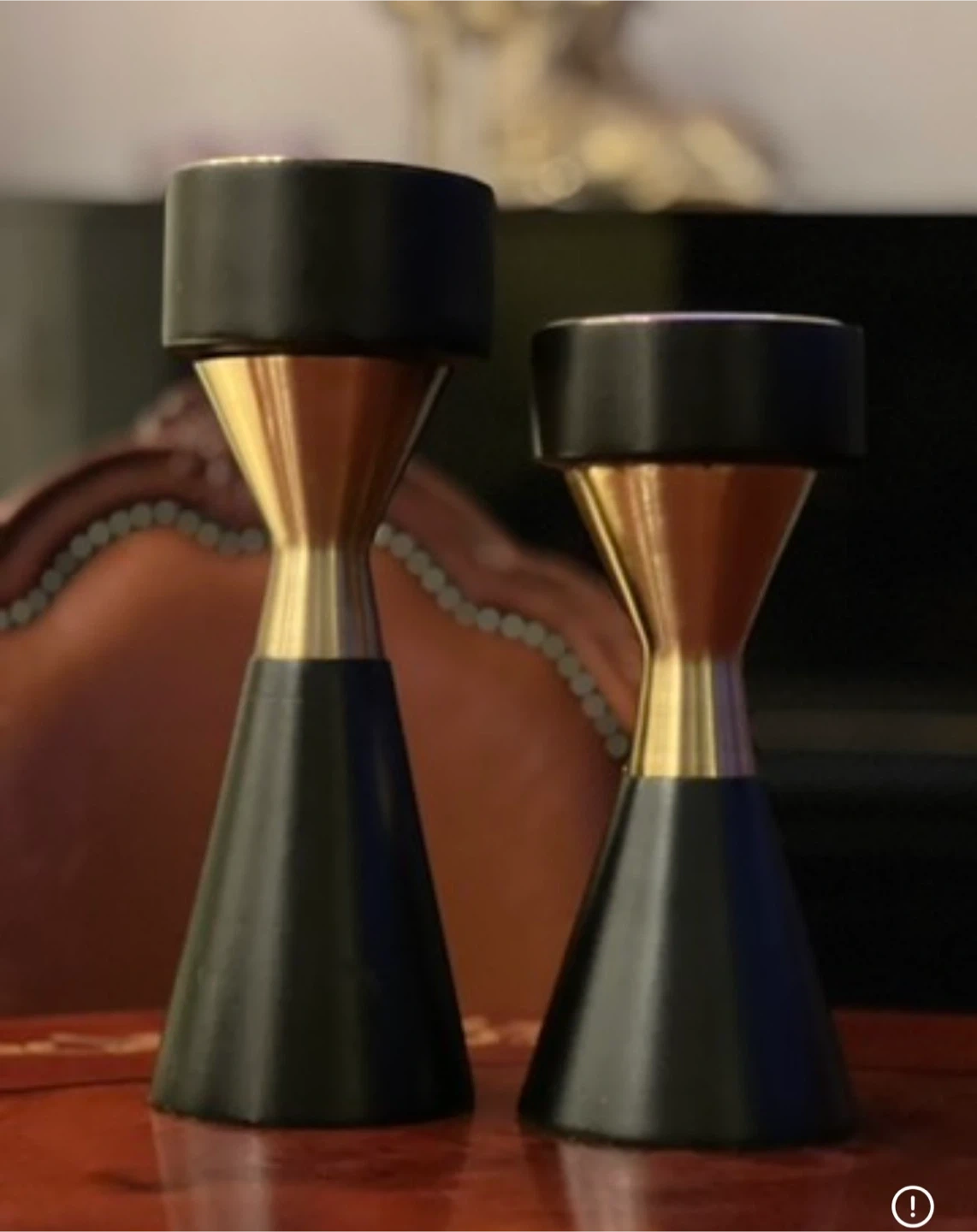 Stylish pair of modern candlesticks, perfect for adding a touch of elegance to any room. They're constructed with a black base and accents, and a metallic gold centrepiece. These would be great on a mantle or dining table!