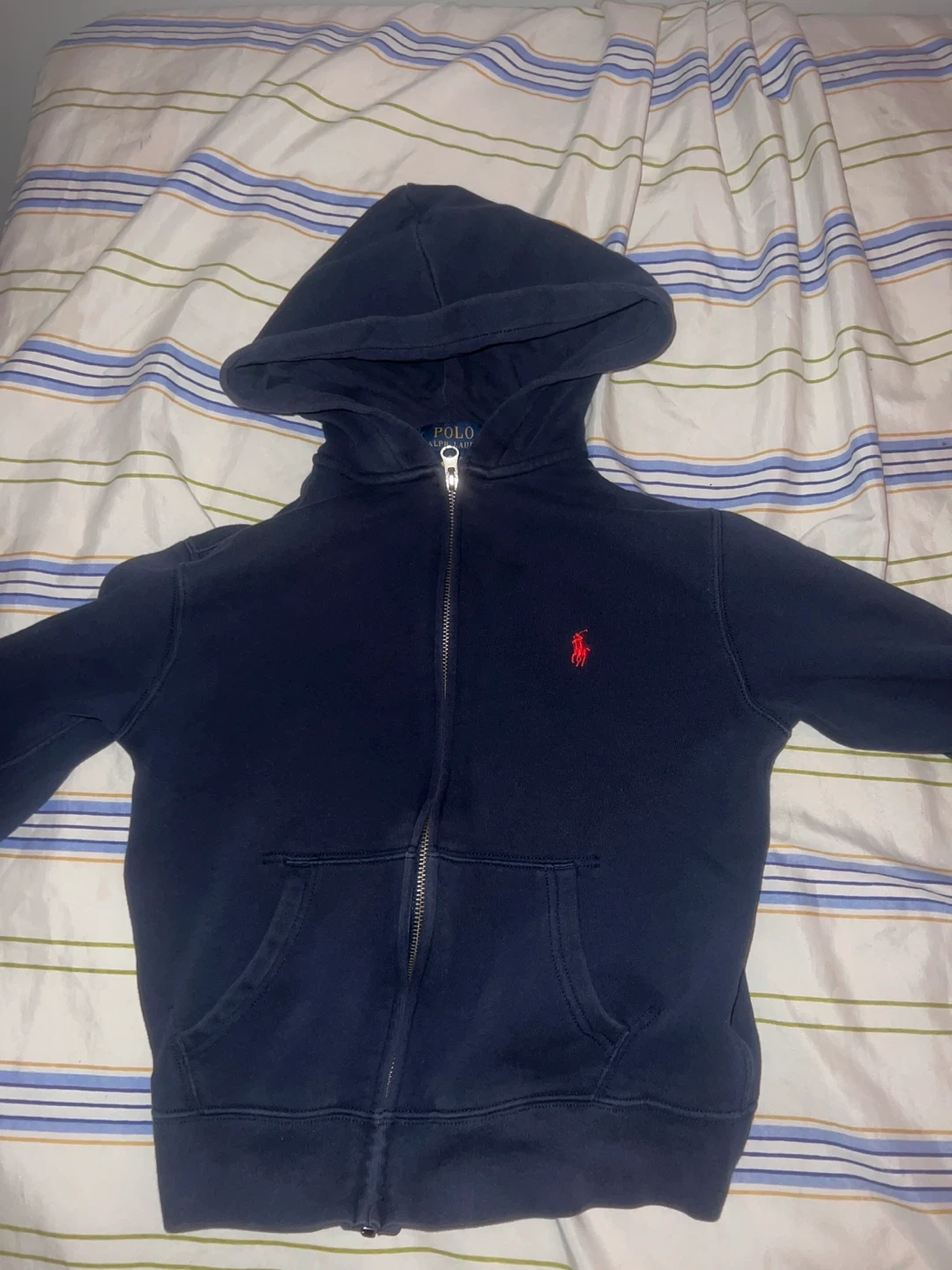 Navy blue Polo Ralph Lauren zip-up hoodie. Youth size medium, fits 10-12. Made in Cambodia. Cotton blend material.