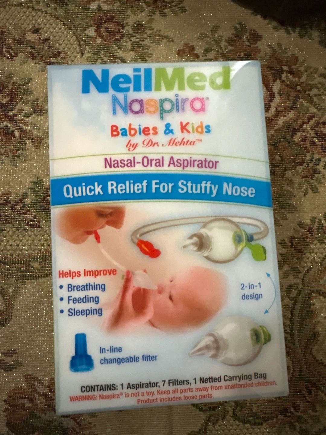 This NeilMed Naspira Nasal-Oral Aspirator is designed for quick relief for stuffy noses in babies and kids. It helps improve breathing, feeding, and sleeping. The kit contains 1 aspirator and 7 netted carrying bags.