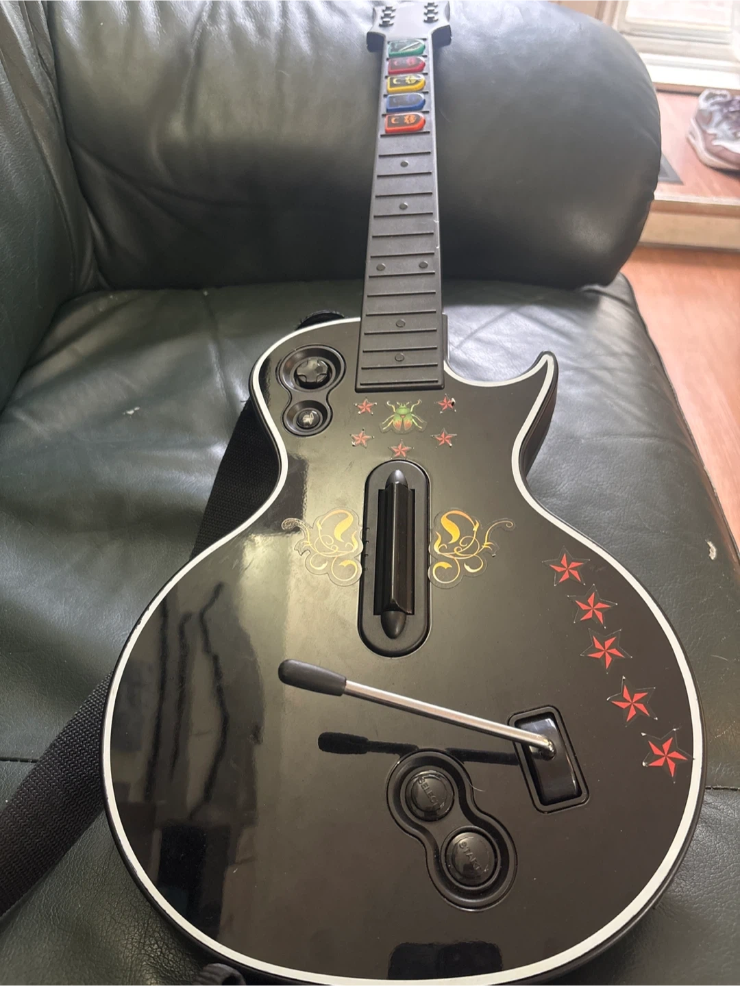 This is a black wireless controller for Guitar Hero. It features multiple coloured fret buttons and a strum bar. Some decorative decals, including a beetle and stars, are on the body.