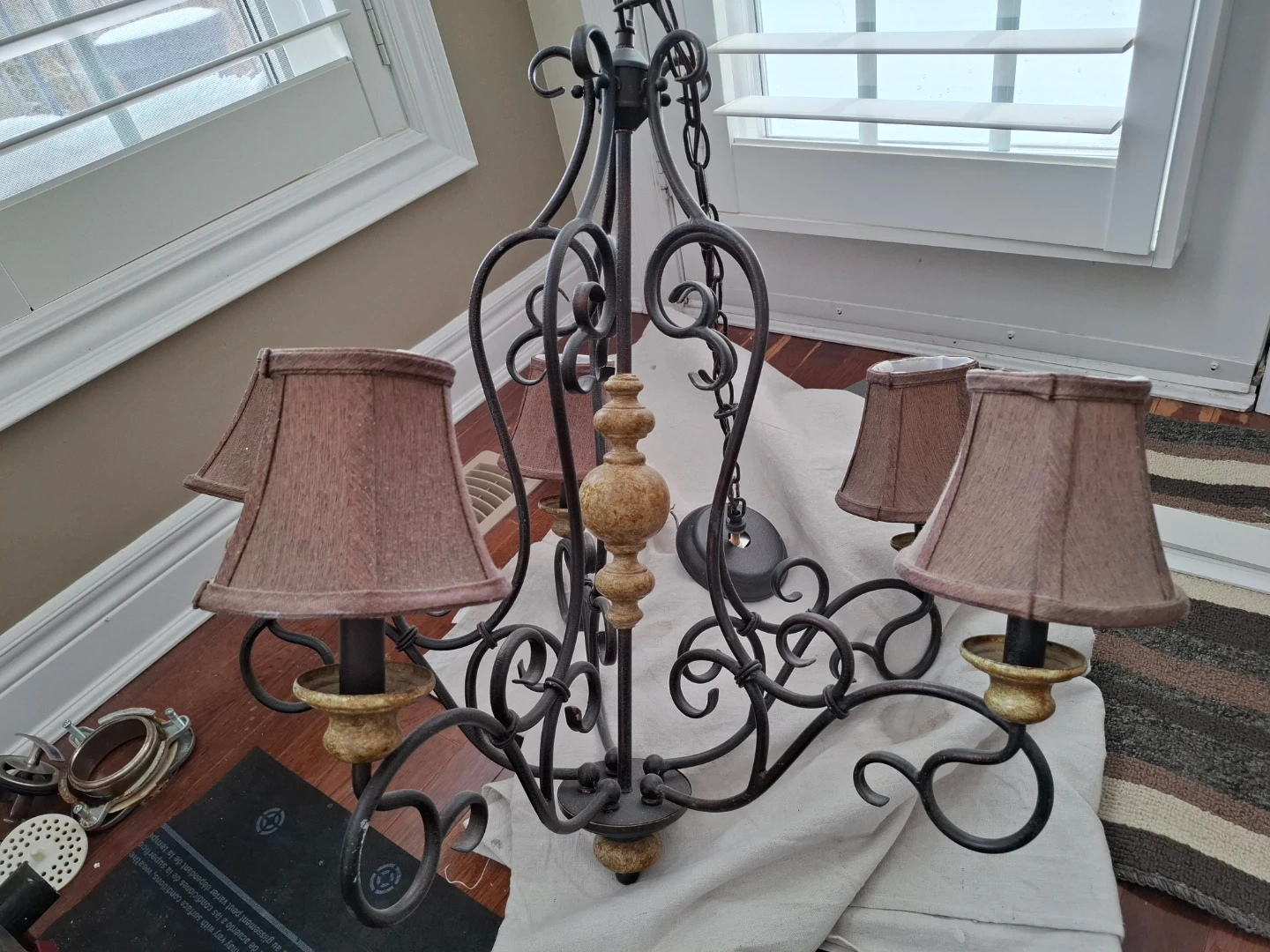 This is a rustic-style chandelier featuring a dark metal frame with ornate scrollwork. It comes with five brown fabric shades, each designed to fit over a light socket. The centrepiece has a light wood or composite turned spindle design. Hangs from the ceiling mount by a chain.