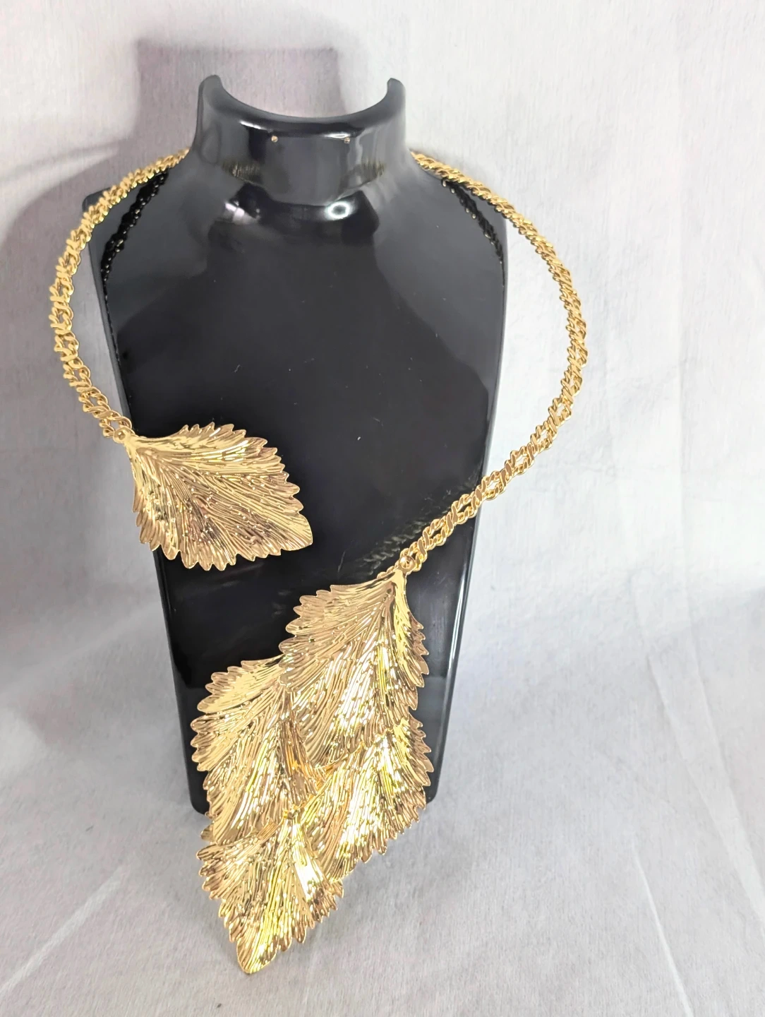 A stunning gold-toned necklace designed with intricate leaf motifs. This statement piece adds a touch of elegance to any outfit. It's a unique accessory for special occasions.