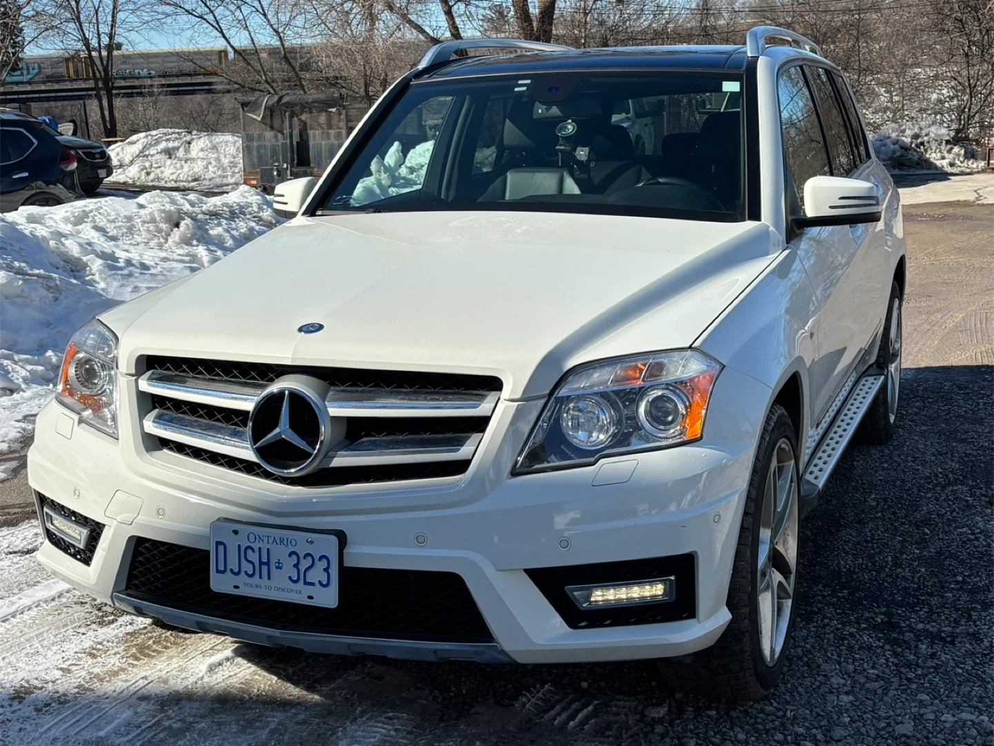 White 2012 Mercedes-Benz GLK 350 SUV with 4MATIC all-wheel drive. This vehicle is equipped with stylish alloy wheels and roof rails. It's a reliable option for various driving conditions. This SUV offers comfort and practicality for daily commutes or longer .