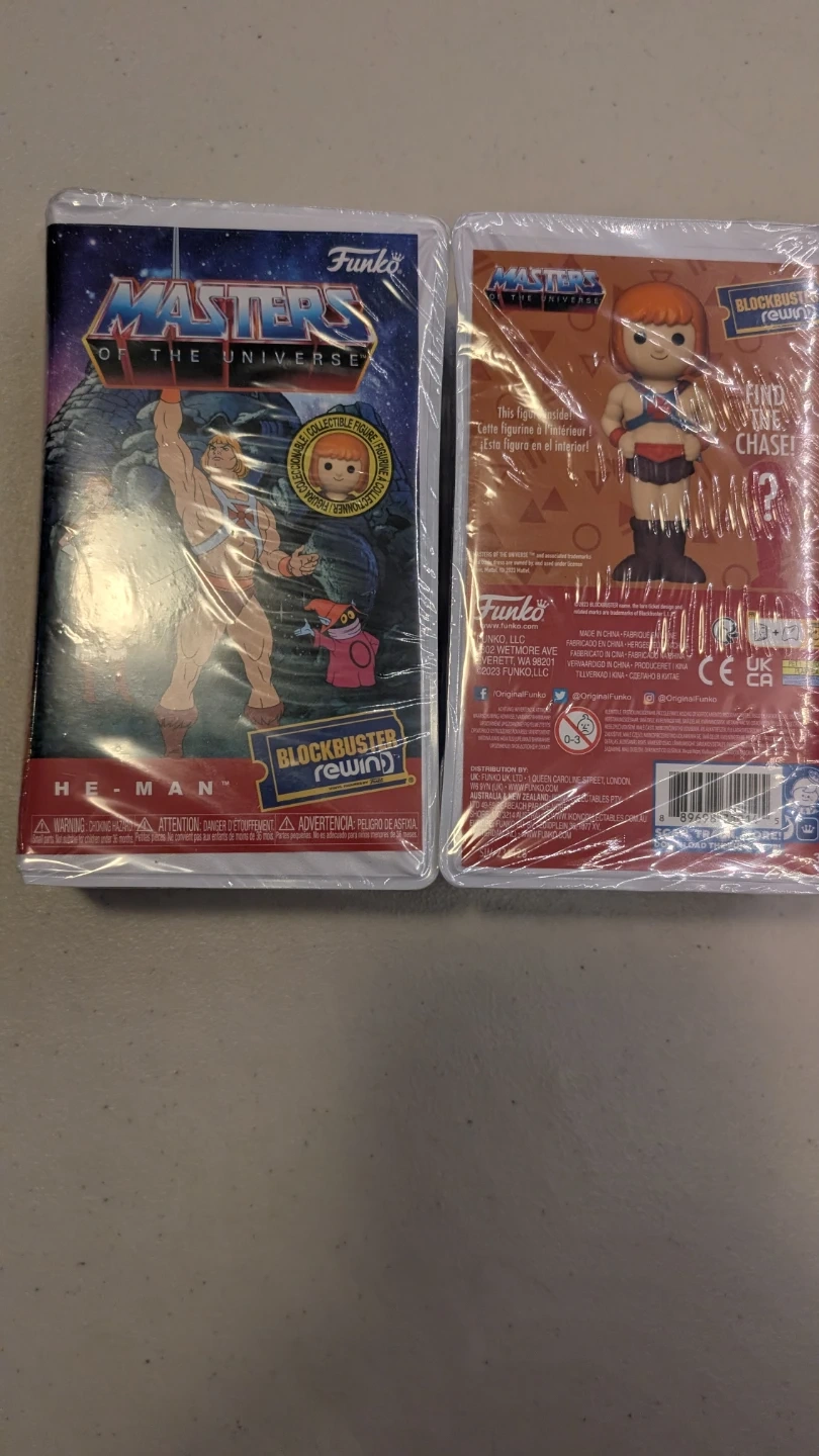 This is a sealed Funko Pop! vinyl figure from the Masters of the Universe collection, featuring He-Man with a Blockbuster Rewind theme. It's still in its original packaging, ready for display. This collectible would be a great addition for any Masters of the Universe fan!